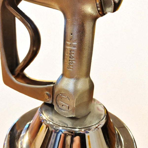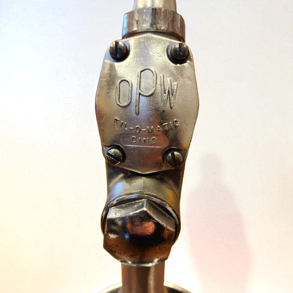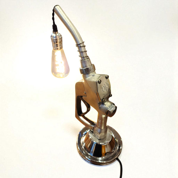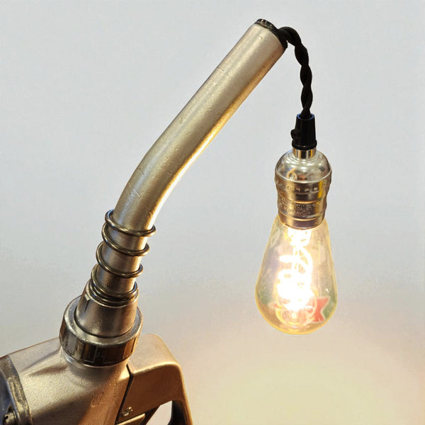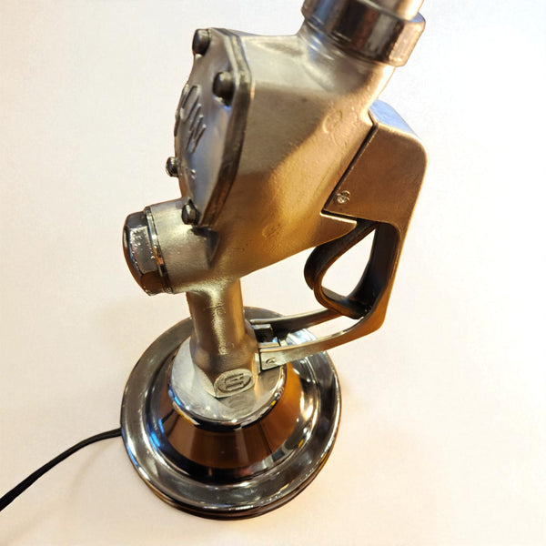 ガソリンスタンドで使われていたノズルをモチーフに、オリジナル金属パーツを組み上げてデザインされた一点もののインダストリアルライトです。重厚なメタルボディとメカニカルなフォルムが融合し、無骨さの中にアート性を感じる仕上がり。