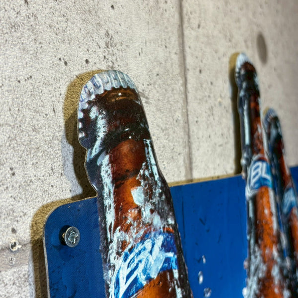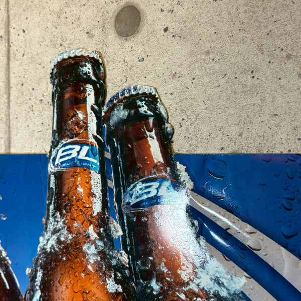 こちらは2011年製のBUD LIGHT(バドライト)看板で、瓶ビールが3本並び、氷と水滴がついた躍動感あふれるデザインが特徴です。ブルーカラーを基調とした爽やかな色味は、見ているだけで冷えたビールの清涼感を感じさせ、空間に活気のある印象を与えます。BUD LIGHTは1982年に登場したアメリカの代表的ライトラガービールで、軽やかな飲み口と爽快感から幅広い層に支持されてきました。看板はバーやパブ、カフェ、ホームバー、ゲームルームなどの空間に飾ることで、アメリカンヴィンテージやビール関連のコレクションに自然に溶け込みます。サイズは幅61cm、高さ74cmで、壁に掛けるだけで存在感のあるアクセントになります。BUD LIGHTファンやアメリカンカルチャー好き、ヴィンテージサインのコレクターにもおすすめの一品です。