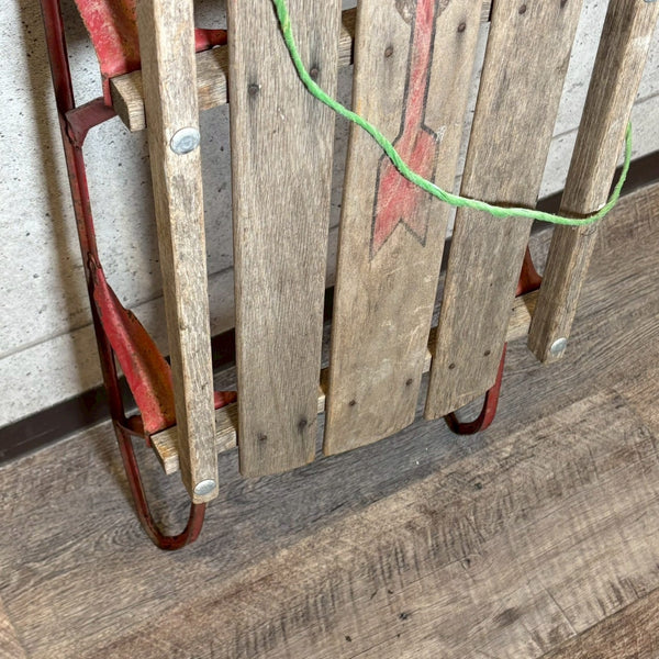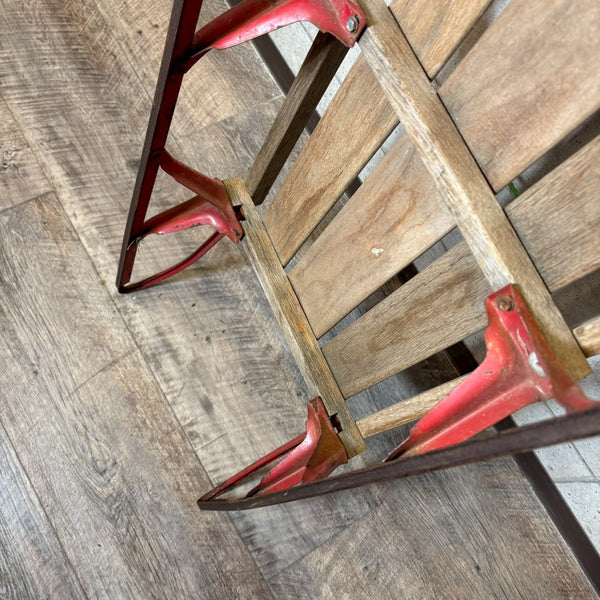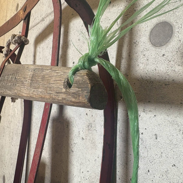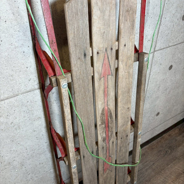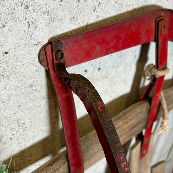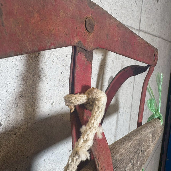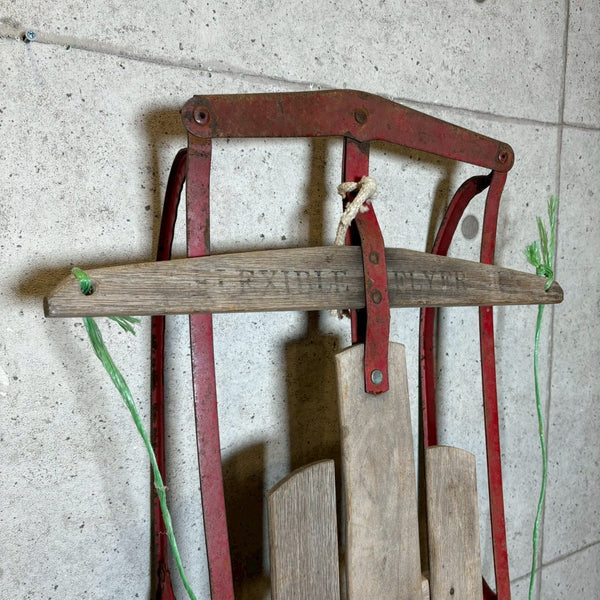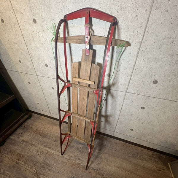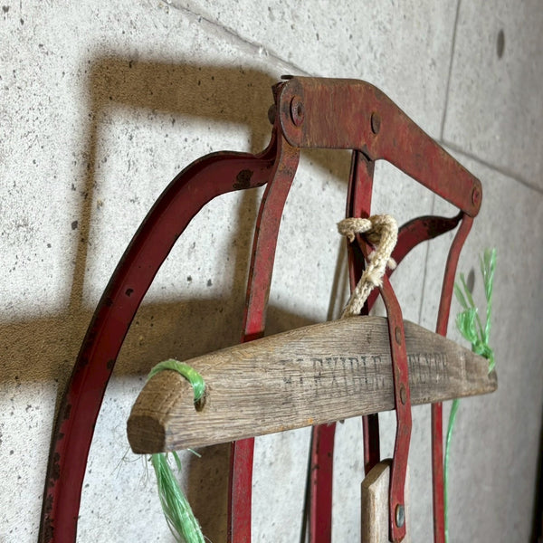 こちらは、アメリカのクラシックなソリブランド 「Flexible Flyer(フレキシブルフライヤー)」 のヴィンテージ木製ソリです。先端の木製部分にはブランド名 「Flexible Flyer」 が刻印され、中央には弓のような赤いマークが描かれています。マークは経年によりかすれていますが、ヴィンテージならではの味わい深い風合いを感じられます。骨組みは赤く塗装された鉄製で、経年によるサビが見られますが、当時のデザインや色彩をそのまま楽しめます。サイズは 幅53cm × 高さ13cm × 奥行き136cm です。