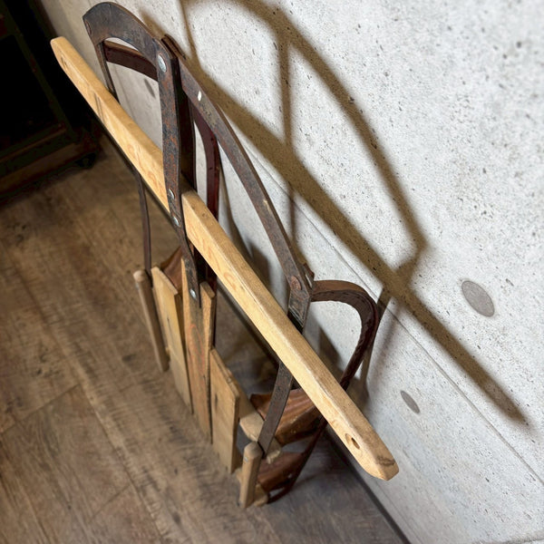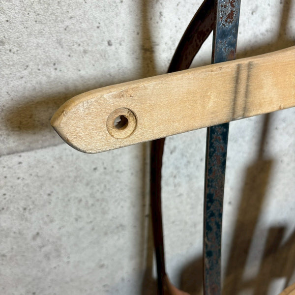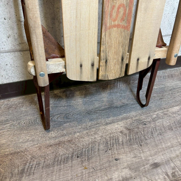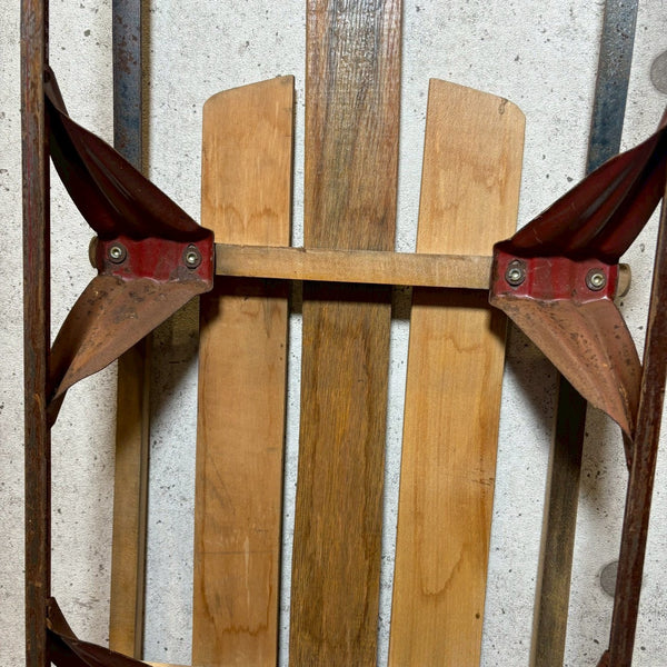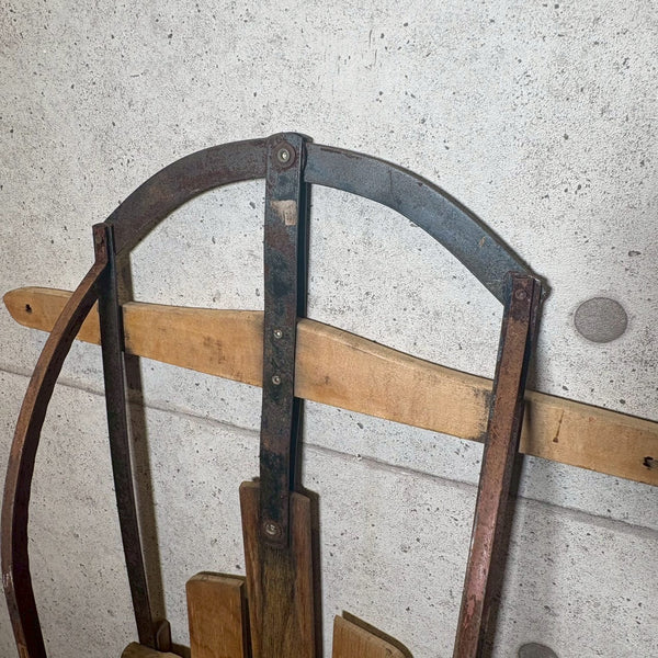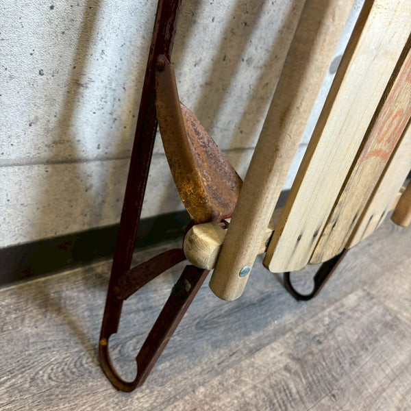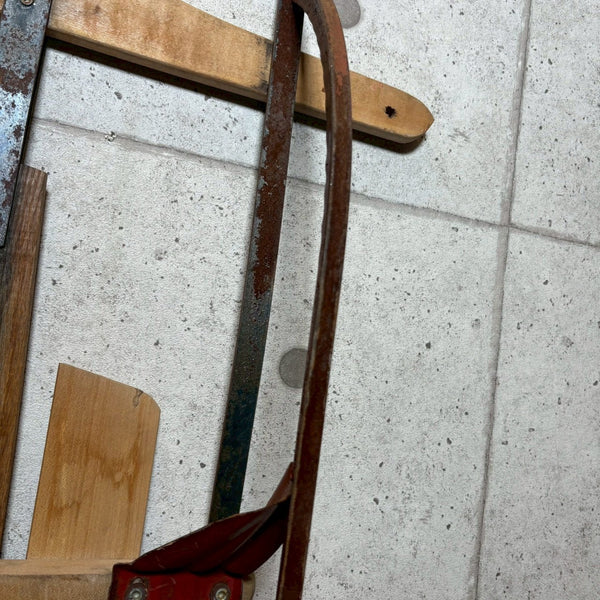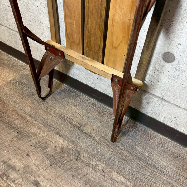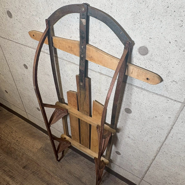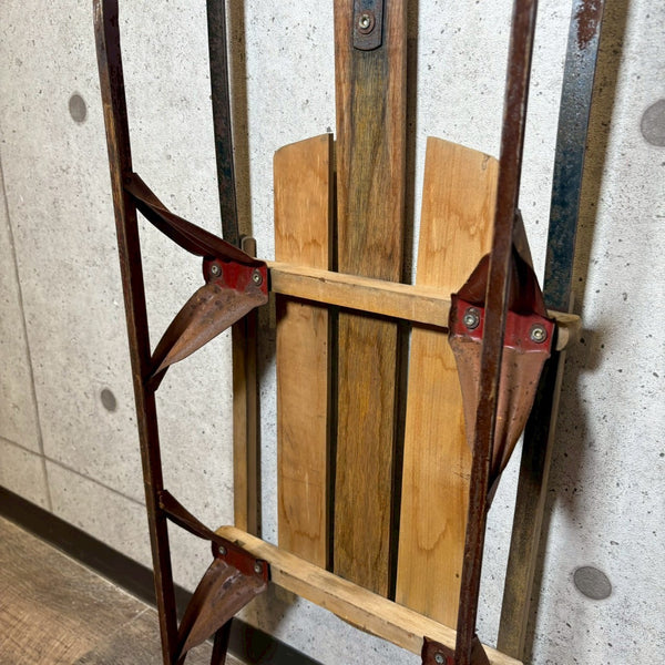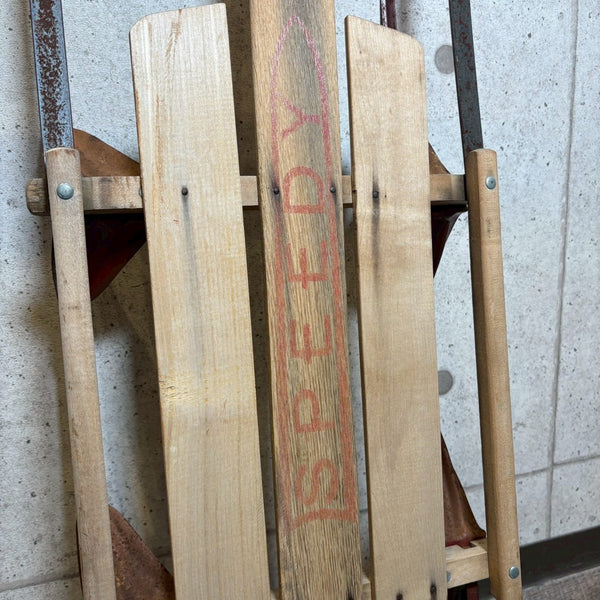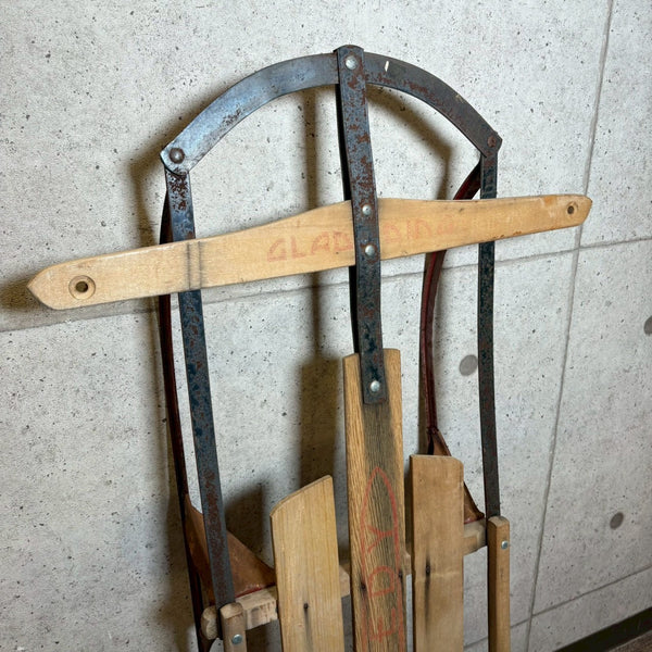 こちらは、アメリカのヴィンテージソリブランド Gladding(グラディング) が製造した 「Speedy」モデル の木製ソリです。長さ約104cm、幅56cm、高さ13cmのコンパクトなサイズで、ディスプレイやコレクションに最適な存在感を持っています。耐久性のある木材と赤い金属レールを組み合わせたクラシックなデザインで、中央には赤い「SPEEDY」のロゴが描かれ、ヴィンテージならではの雰囲気を演出しています。経年による塗装の剥がれや金属部分の錆、木部の劣化などがありますが、それもまた長い歴史を感じられる味わいです。