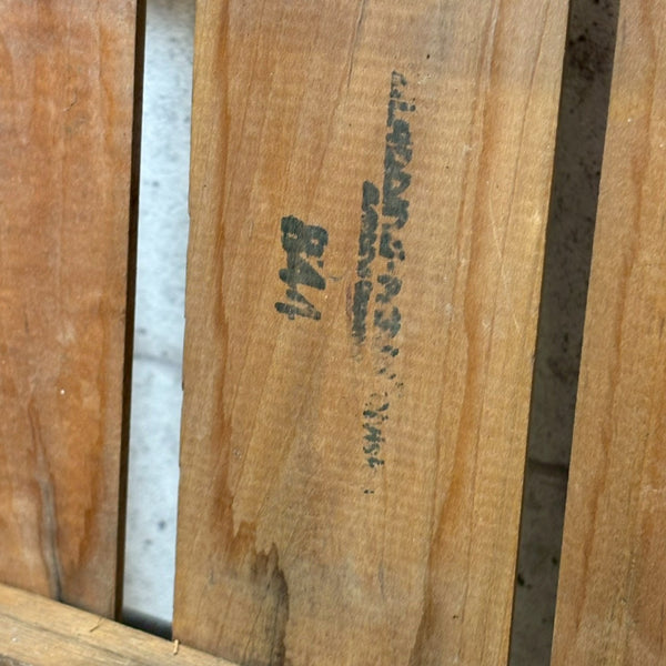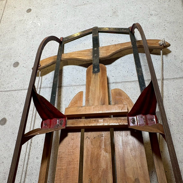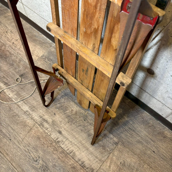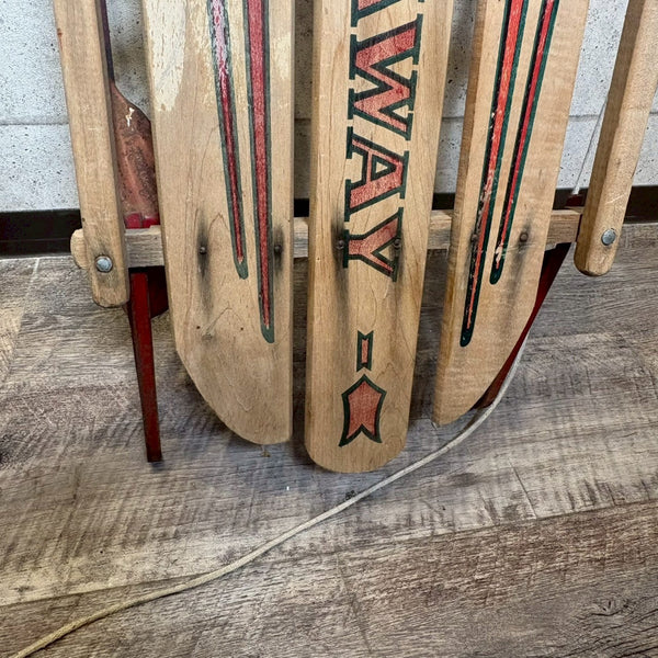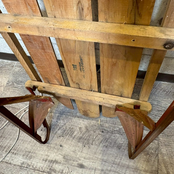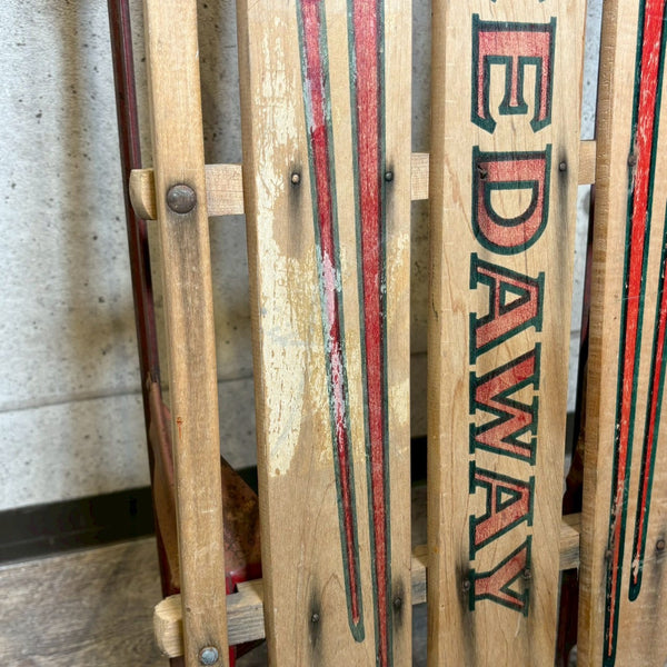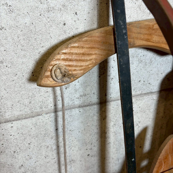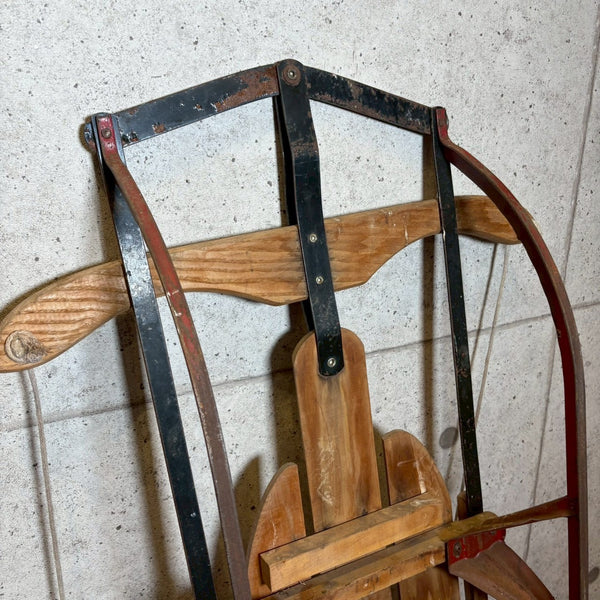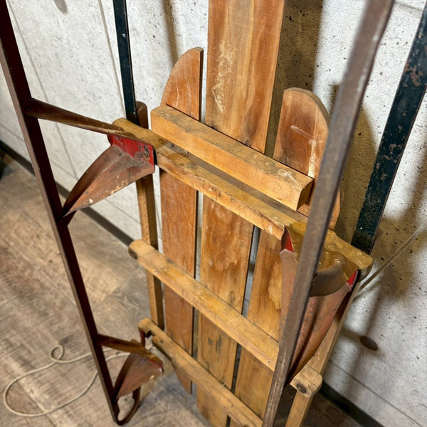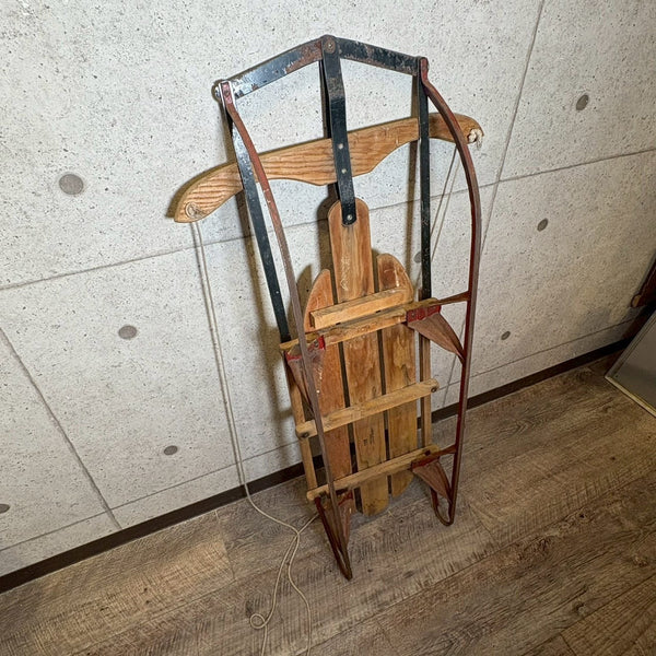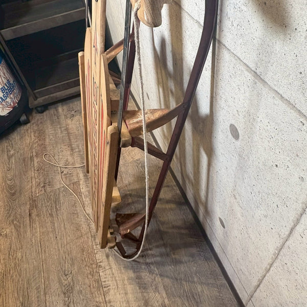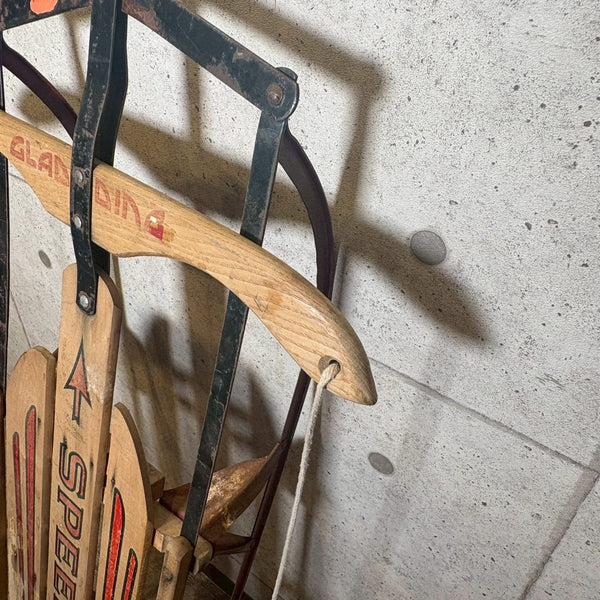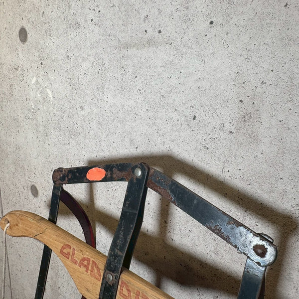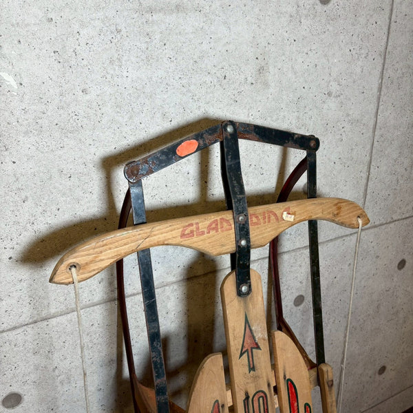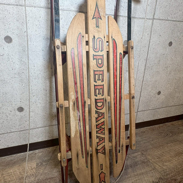 こちらは、アメリカのヴィンテージソリブランド Gladding(グラディング) が製造した 「SPEEDWAY」モデル の木製ソリです。長さ約113cm、幅55cm、高さ15cmのサイズで、存在感のあるフォルムが特徴です。木製のボディに赤い金属レールを組み合わせたクラシックなデザインで、中央には「SPEEDWAY」のロゴが描かれており、ヴィンテージならではの趣を感じられます。経年による塗装の剥がれや金属部分の錆などが見られますが、それもまた歴史を感じさせる魅力として楽しめる一点です。