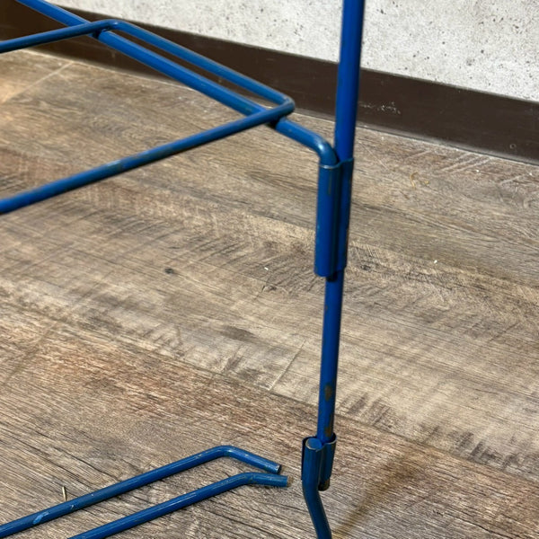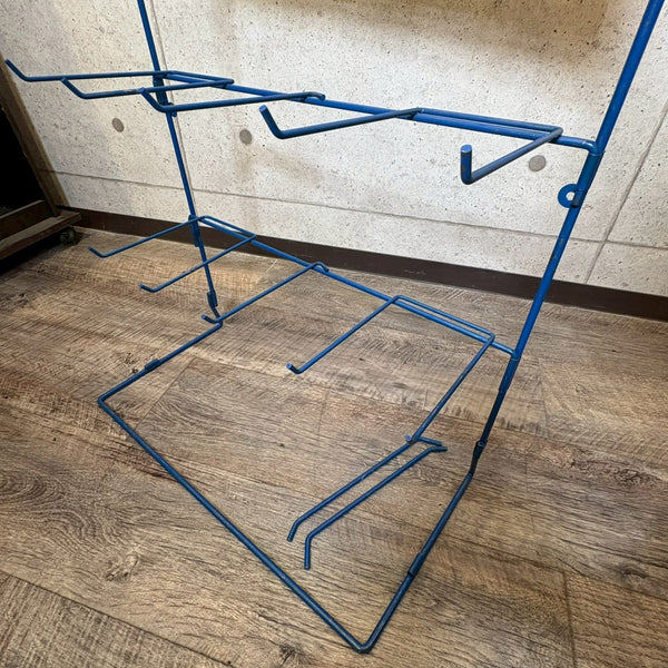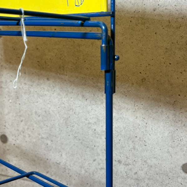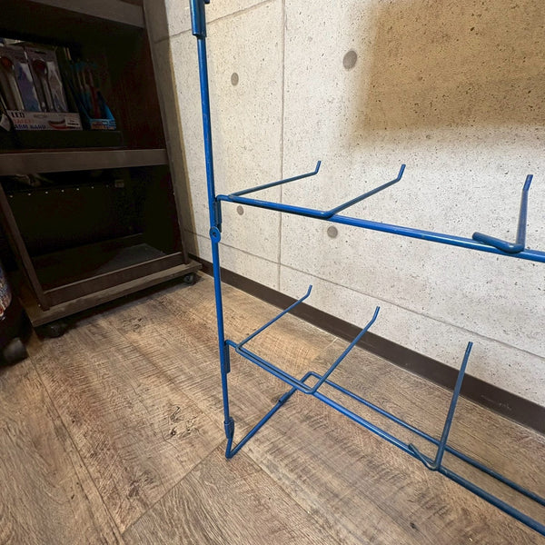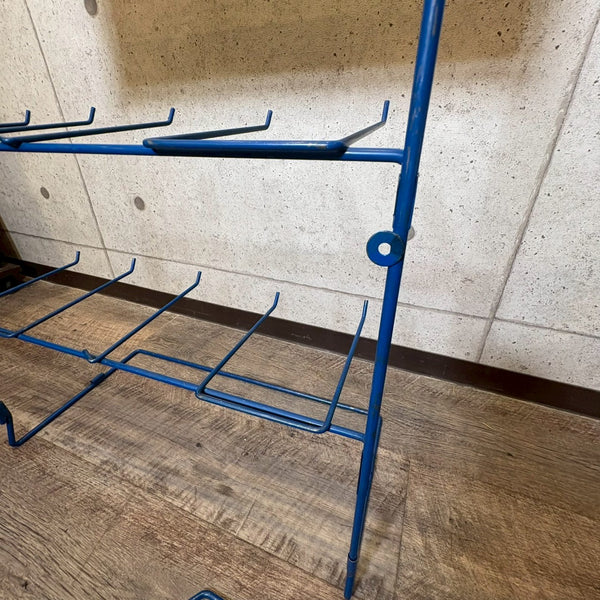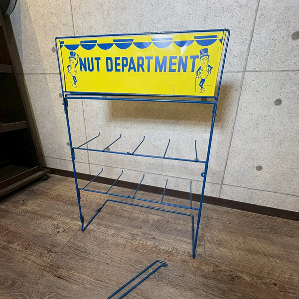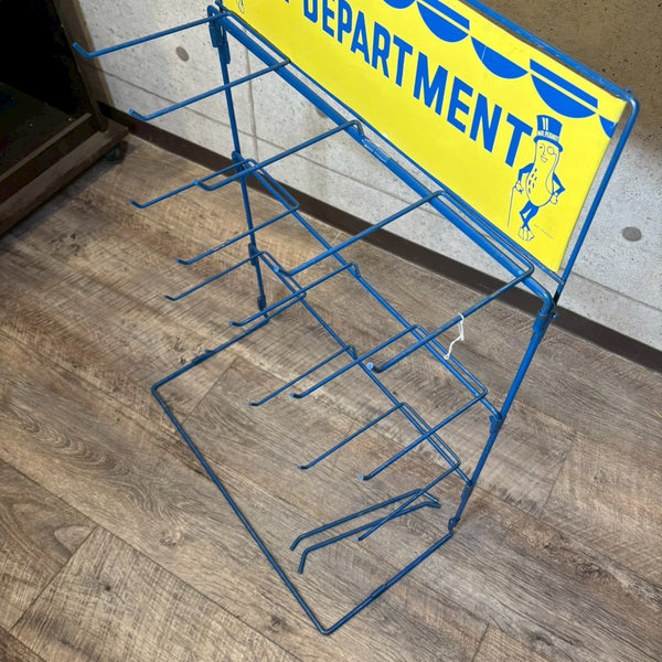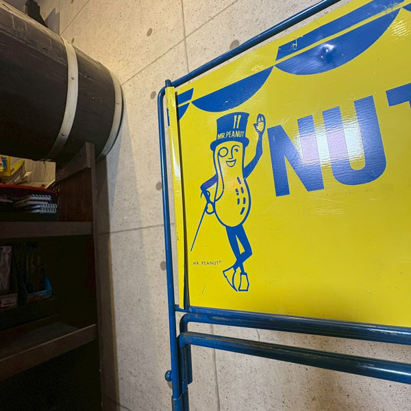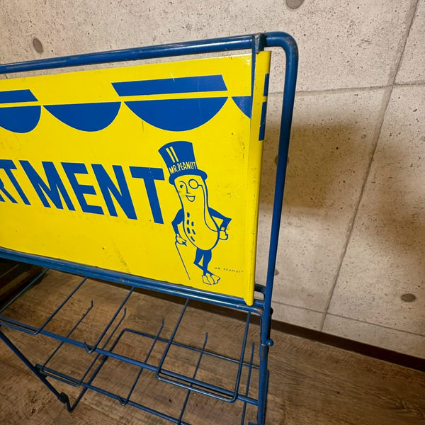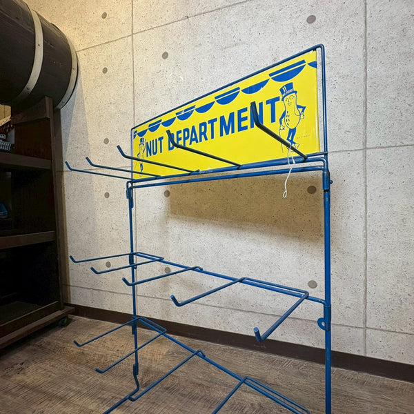 こちらは、ヴィンテージの 「NUT DEPARTMENT」販促用ディスプレイラック で、アメリカのピーナッツブランドを象徴するキャラクター Mr. Peanut が描かれています。青いワイヤーで作られたラックには商品を吊り下げるためのフックが付いており、上部の看板には「NUT DEPARTMENT」と表示されています。床置き型としてだけでなく壁掛けとしても使用できる 2WAYタイプ で、店舗のスペースやディスプレイのスタイルに応じて設置方法を選べます。Mr. Peanutは1916年にPlanters社によって誕生したマスコットで、長年にわたりナッツ製品の広告や販促に活用されてきました。このラックは、当時の店舗販促の文化やブランドの歴史を感じさせるヴィンテージアイテムで、コレクションやアメリカンヴィンテージインテリアとしても魅力的です。サイズは幅55cm、高さ83cm、奥行き28cmで、店舗ディスプレイ、コレクションルーム、またはアメリカンポップカルチャーを取り入れたインテリアのアクセントとして最適です。特にヴィンテージ広告やブランドマスコットコレクションに関心のある方、ユニークなディスプレイアイテムを楽しみたい方におすすめでき、当時の広告文化や店舗の雰囲気を空間に再現できる一品です。