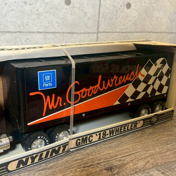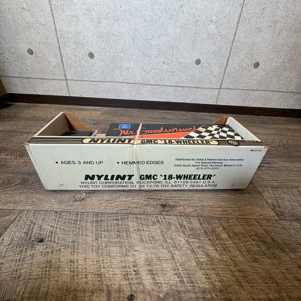 こちらはアメリカの玩具メーカー NYLINT(ナイリント) が製造した GMC 18 Wheeler トレーラー で、サイドにはゼネラルモーターズ(GM)の公式サービスブランド 「Mr. Goodwrench」 の筆記体ロゴが描かれたヴィンテージアイテムです。「Mr. Goodwrench」は1977年に導入されたGMのサービスブランドで、ディーラーの整備や修理サービスを統一して提供するためのマーケティングキャンペーンとして誕生しました。そのロゴが描かれたこのトラック玩具は、当時のアメリカの自動車文化や物流文化を反映しており、リアルなデザインと存在感が魅力です。