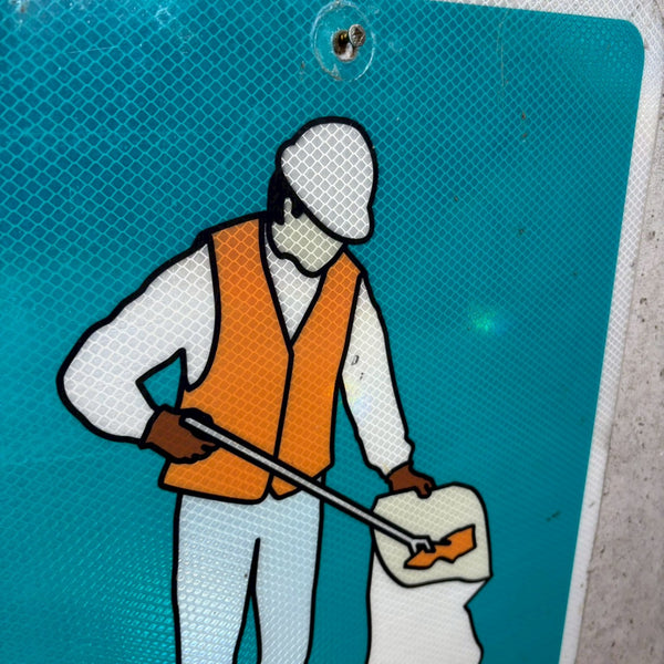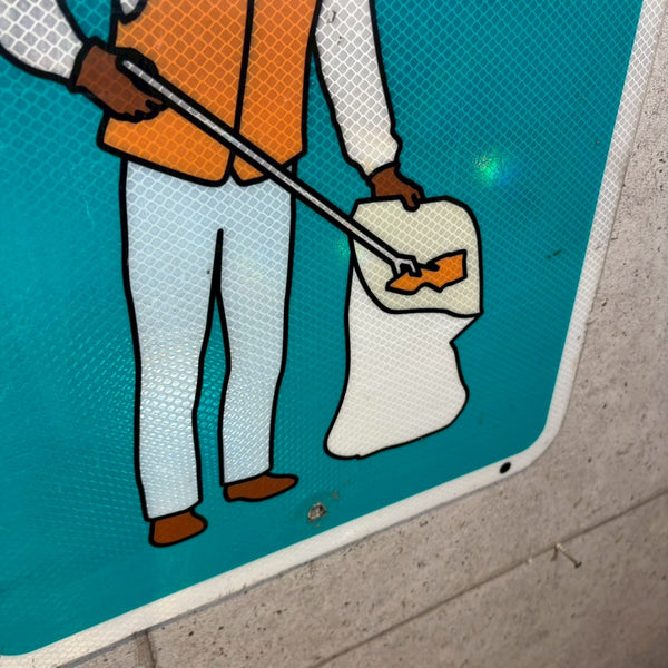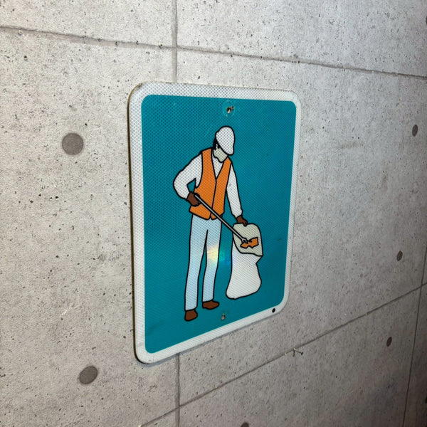 このような標識は、アメリカの自治体や道路管理機関で、道路沿いの美化や安全啓発を目的として長年使用されてきたもので、特に「ゴミ拾い」を呼びかけるサインは公共マナーの象徴として設置されていました。現地で実際に使われていたものは、アメリカンヴィンテージ・コレクターの間で珍重されるアイテムです。