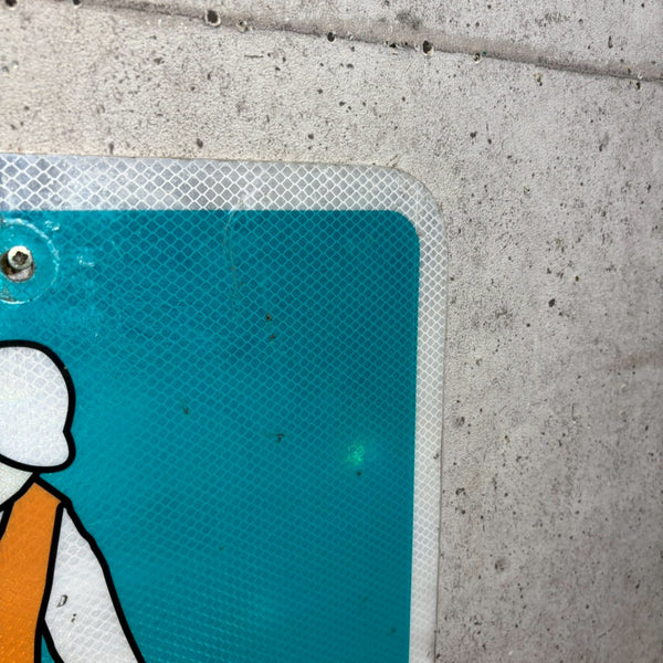 アメリカンスタイルの トラフィックサイン「ゴミ拾い」 です。道路や歩道、公園などでの設置に適した視認性の高いデザインとなっています。黄色やオレンジ系の配色が一般的なアメリカの交通標識を彷彿とさせ、日常の景観の中で強い存在感を放ちます。