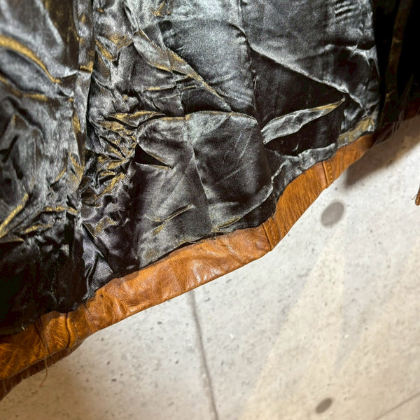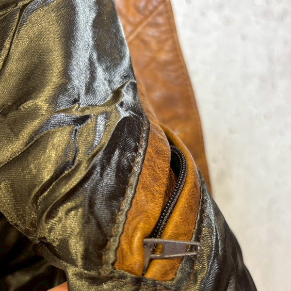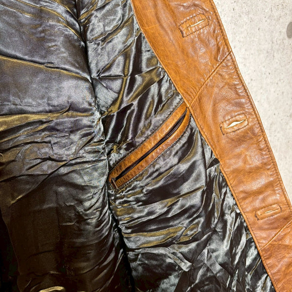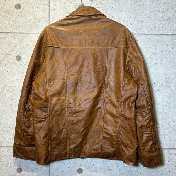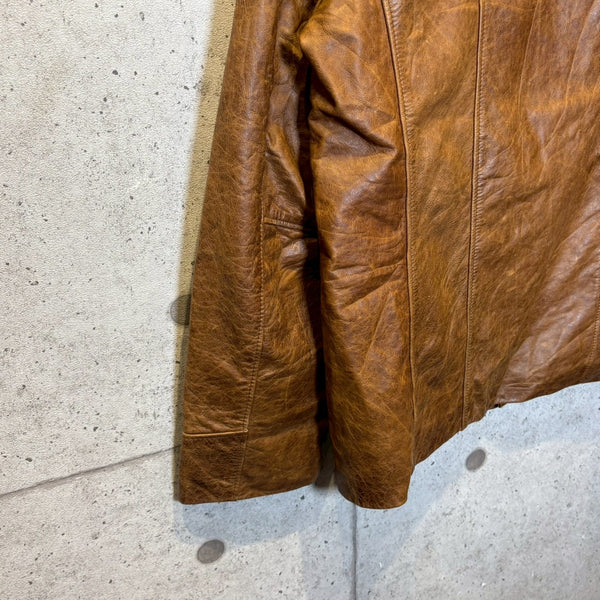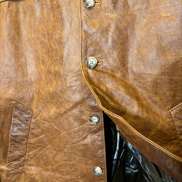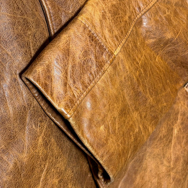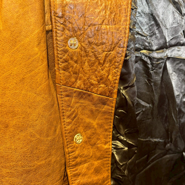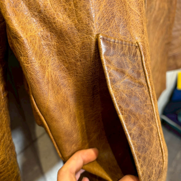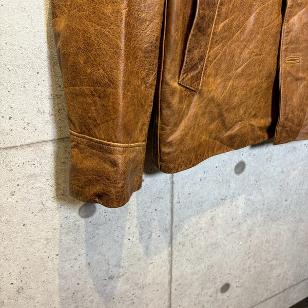 さらにタグにある LAVORAZIONE ARTIGIANALE(手工芸的製造) は、機械的な大量生産ではなく、熟練職人による工程を経て仕立てられていることを示します。イタリアは古くから皮革産業が盛んで、特にフィレンツェやミラノを中心に培われたレザー文化は世界的に高い評価を受けています。裁断、縫製、仕上げに至るまで丁寧に作り込まれた一着は、シルエットや着心地にも確かな違いが現れます。