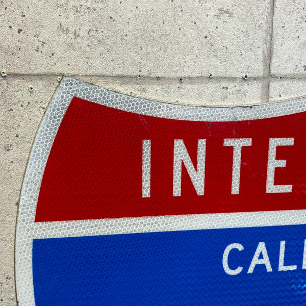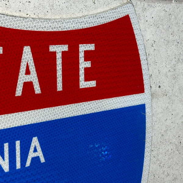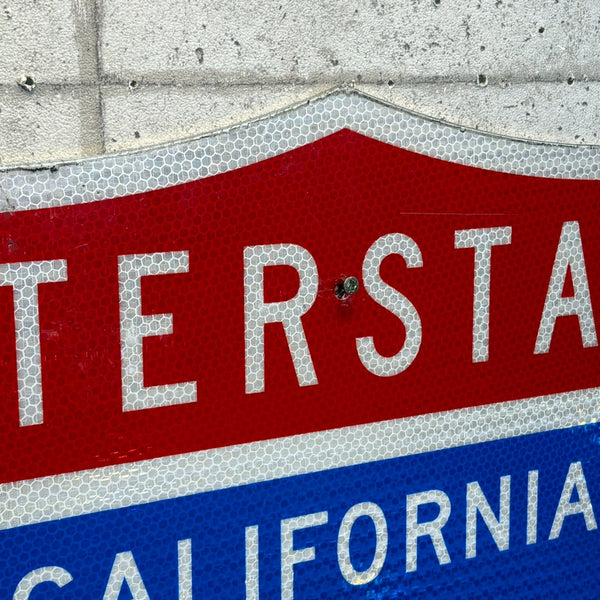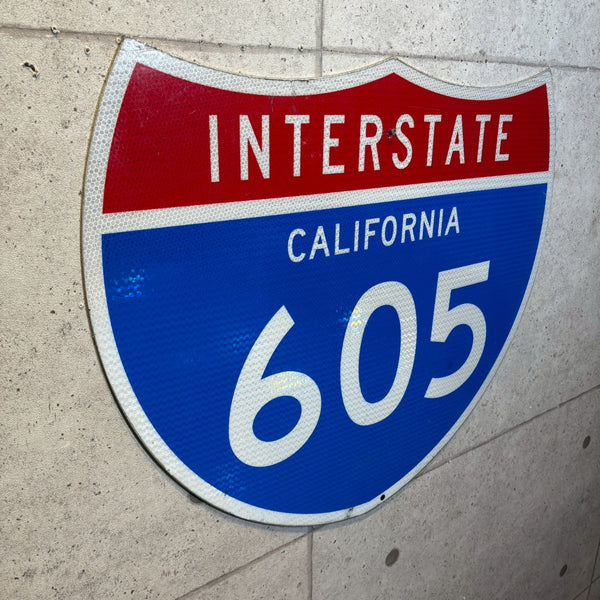 アメリカ・カリフォルニア州で実際に使用されていた「INTERSTATE 605」ハイウェイサインです。赤・白・青の3色で構成されたシールド型のデザインは、アメリカの高速道路標識の定番スタイル。使用に伴うキズや色あせが本物の風合いを感じさせる、リアルなヴィンテージアイテムです。