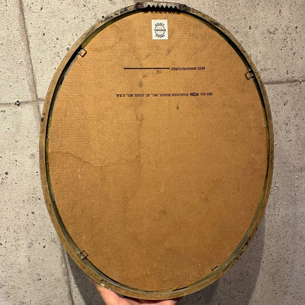 デンマークの名門ビールブランド Carlsberg(カールスバーグ) のロゴがあしらわれた、楕円型のヴィンテージ・パブミラーです。楕円形のフレームに収められたクラシカルなミラー面には、カールスバーグの象徴的なロゴと王冠のモチーフがデザインされており、シンプルながらも気品のある印象を与えます。程よく存在感があり、壁掛けでも棚置きでも映える万能なサイズ感です。