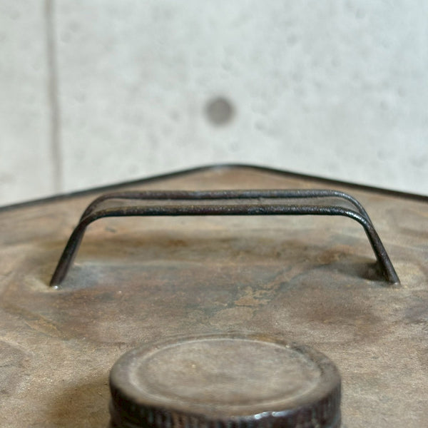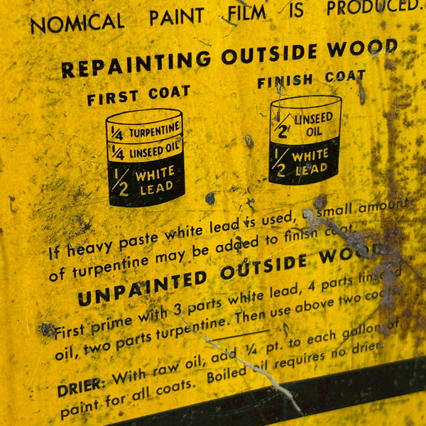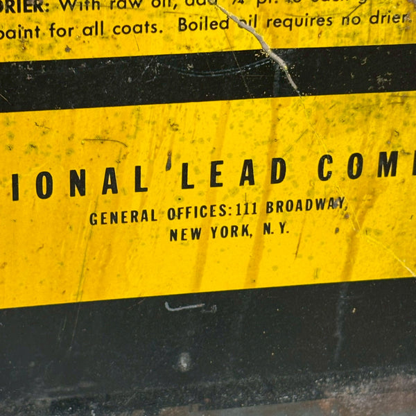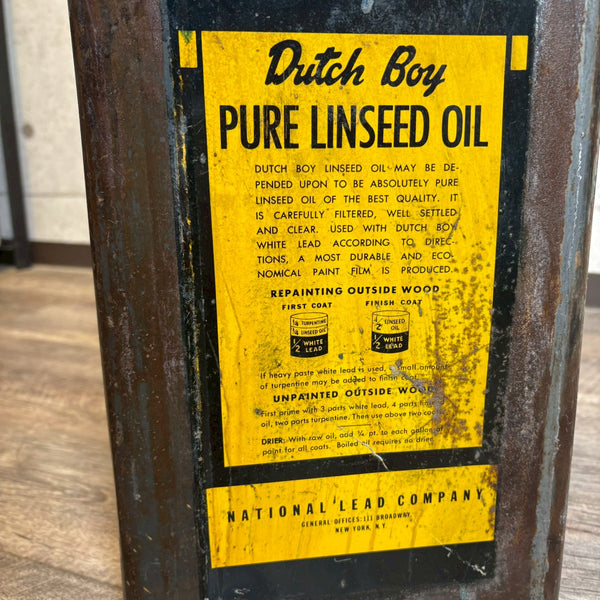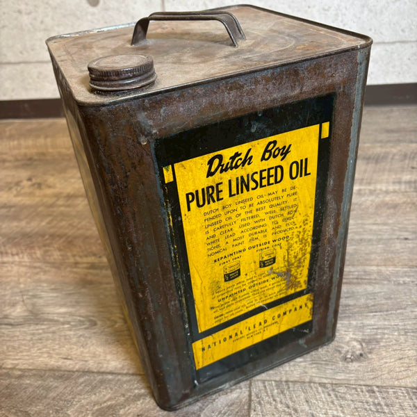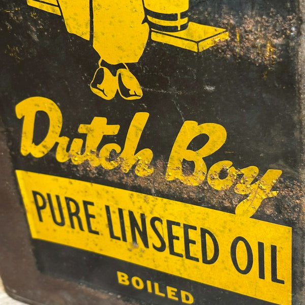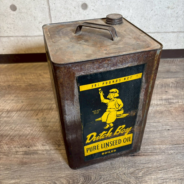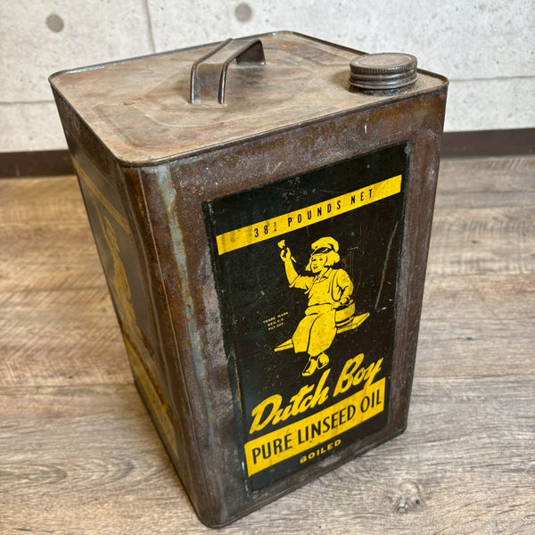 アメリカの老舗ペイントブランド Dutch Boy(ダッチボーイ) が手掛けた「Purfe Linseed Oil(ピュア・リンシードオイル)」の一斗缶です。黒を基調とした重厚な背景に、鮮やかなイエローで描かれたトレードマークの少年「ダッチボーイ」が印象的なデザイン。側面には「GENERAL OFFICES: 111 BROADWAY, NEW YORK, N.Y.」の表記があり、当時の企業所在地やアメリカの産業デザインの息づかいを感じさせる貴重な一点です。