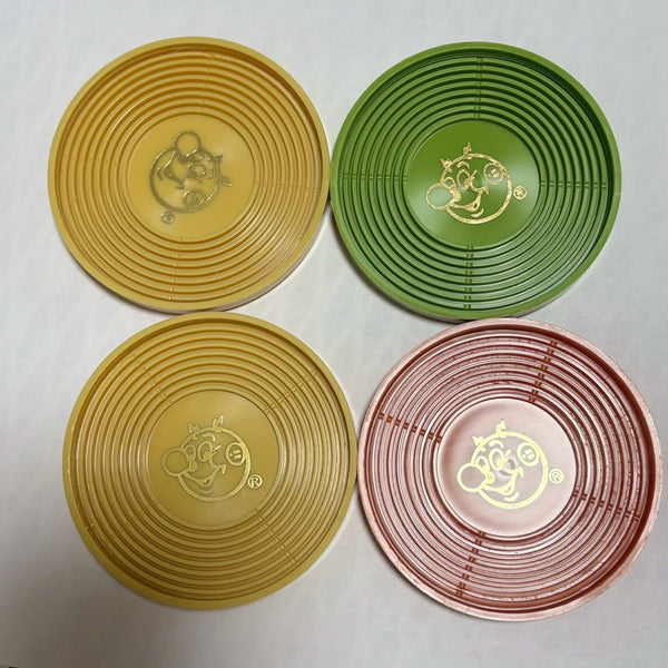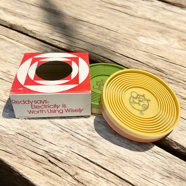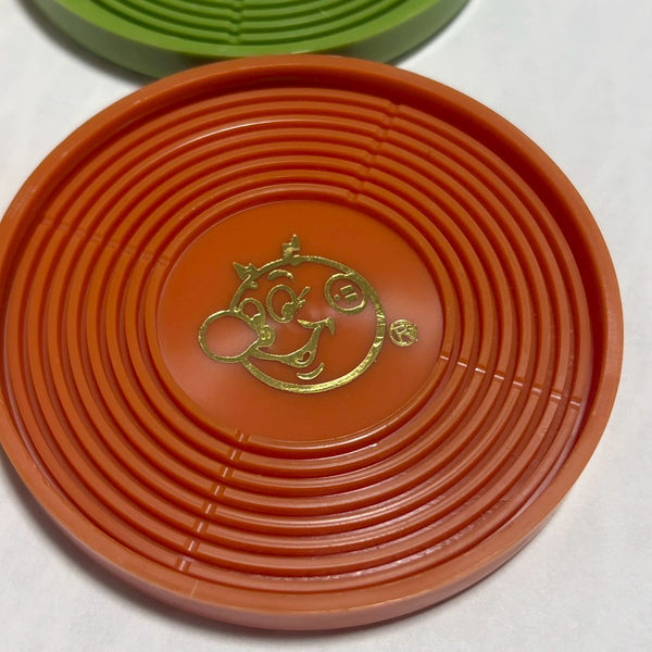 こちらは、レディキロワットのキャラクターがあしらわれた、ヴィンテージのプラスチック製コースター4枚セットです。アメリカの電力会社の広告・販促品として制作されたアイテムで、ミッドセンチュリー期らしい明るく親しみやすいデザインが魅力です。
