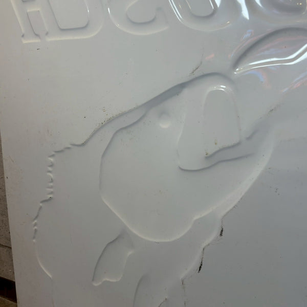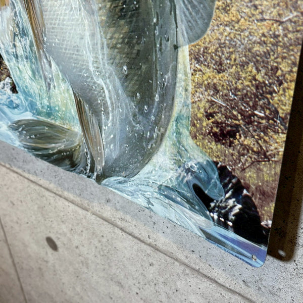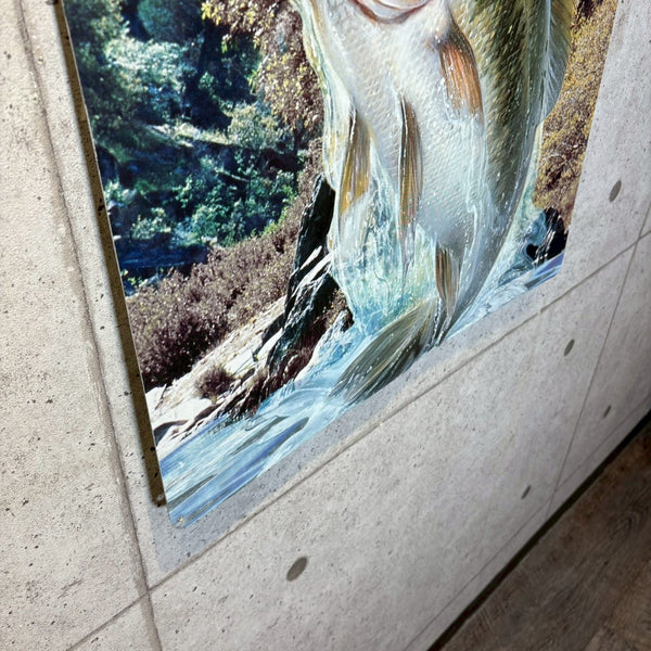 こちらはアメリカ・BUSCH BEER(ブッシュビール)のロゴと、躍動感あるラージマウスバスのイラストが描かれた2000年製メタルサインです。サイズはW:57cm H:81cmと存在感のある大判タイプ。湖畔での釣りやアウトドアシーンを思わせるデザインで、アメリカンバーやガレージ、キャンプ好きのインテリアにもぴったりの一枚です。