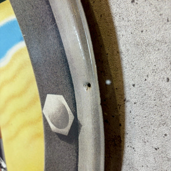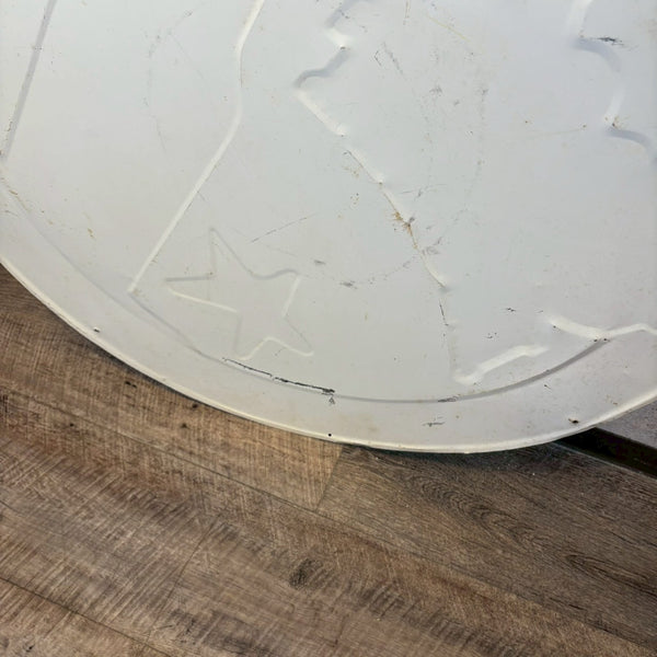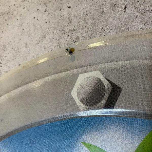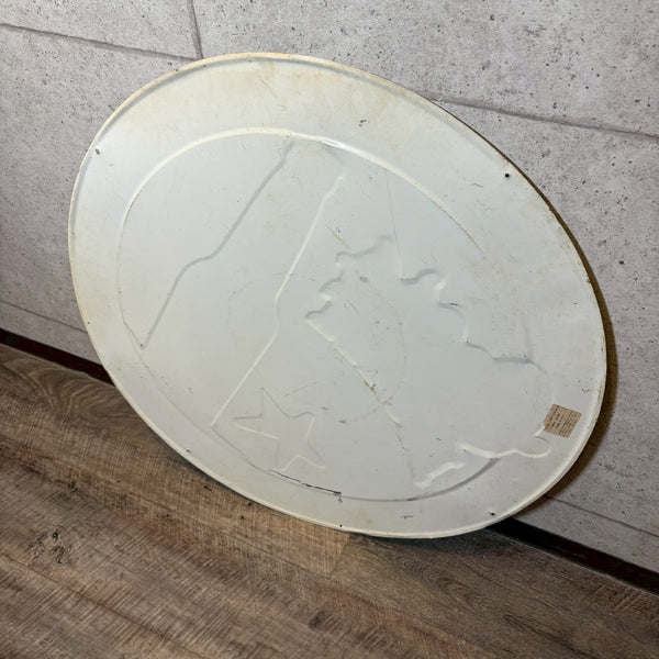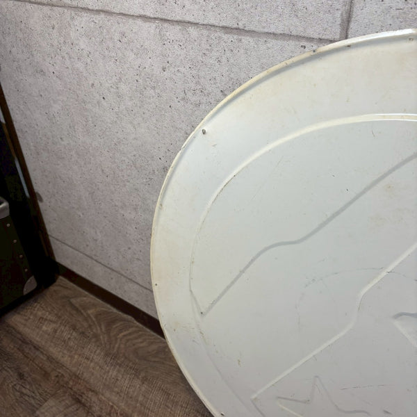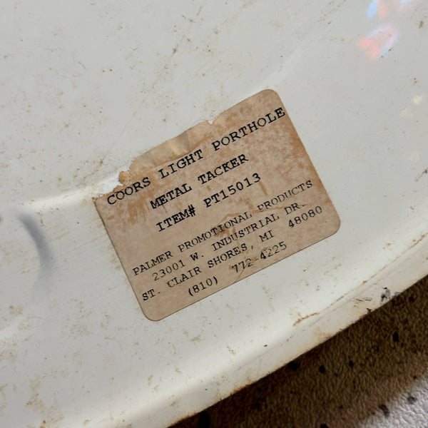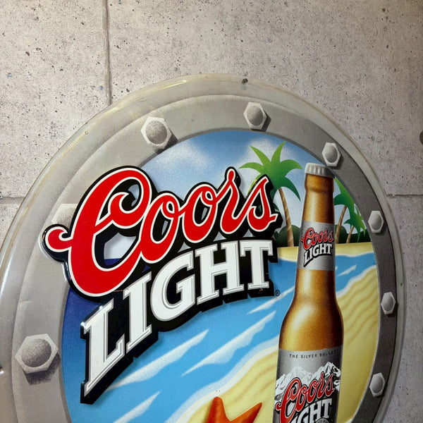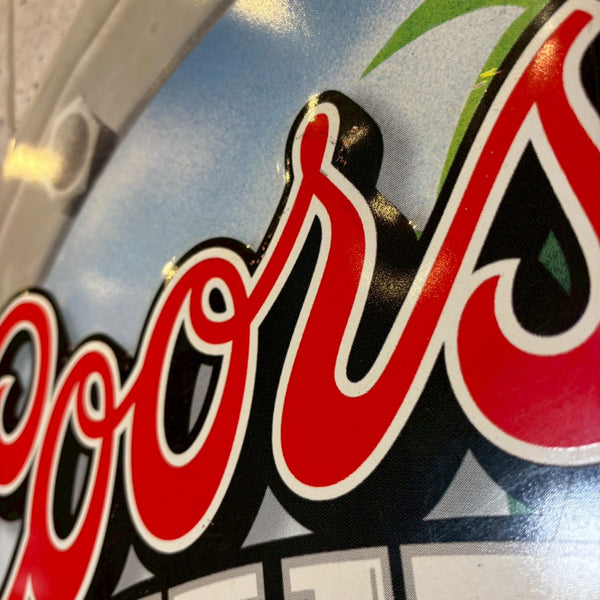 こちらは、アメリカのビールブランド Coors Light(クアーズ・ライト) の2001年製メタル看板です。サイズはW:81cm H:81cmと存在感のある円形デザインで、浜辺に置かれたクアーズのボトルが描かれた、夏らしさと清涼感あふれる一枚です。波打ち際の光やボトルの冷たさを感じさせる色彩が印象的で、見るだけでリゾート気分を味わえるデザインとなっています。