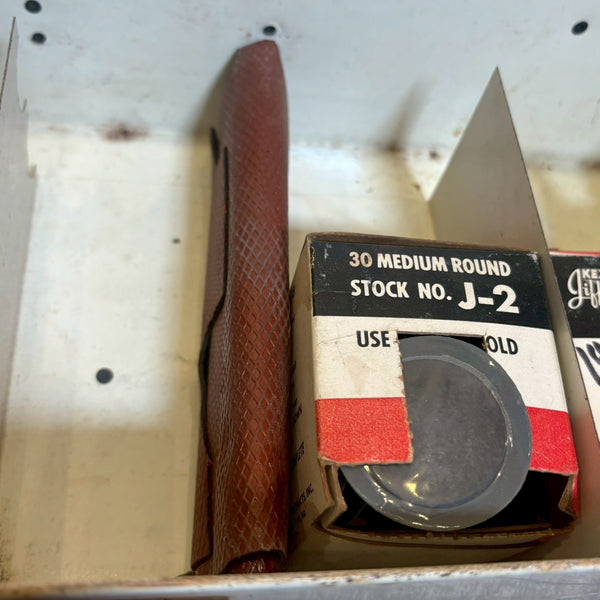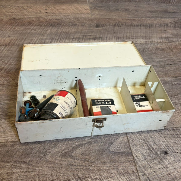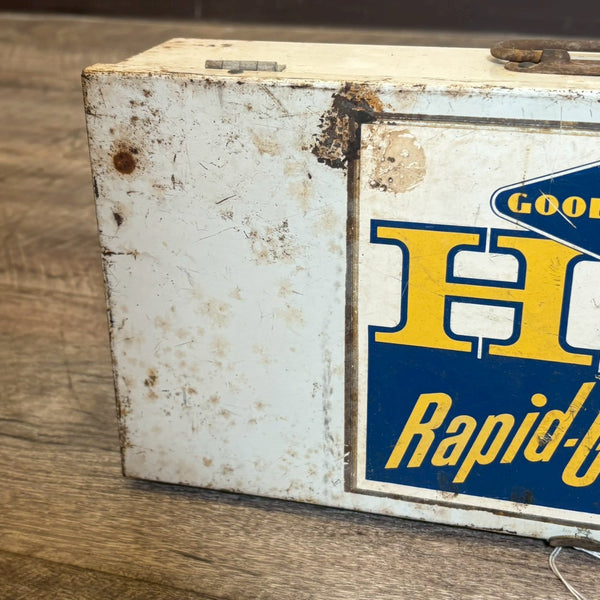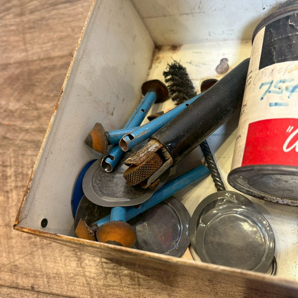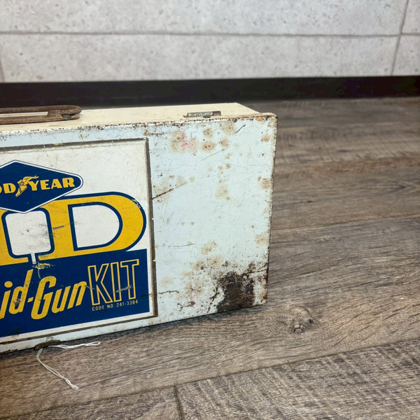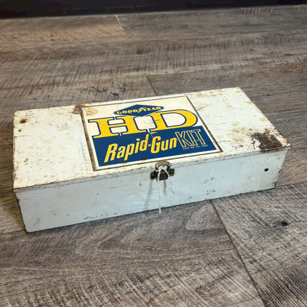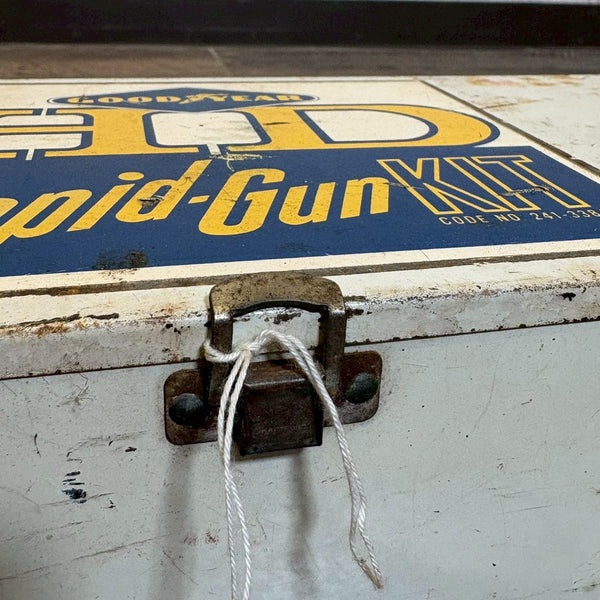 グッドイヤーは1898年創業の米国・オハイオ州の企業で、航空機からレーシングまで幅広くタイヤ技術を発展させてきた歴史を持ちます。この「HD Rapid Gun Kit」は、主にエアツールやタイヤの空気圧整備、機械メンテナンスの現場で使われていたもので、ガレージや修理工場などでプロフェッショナル向けに配布・販売されていた実用モデルです。硬質なケースにしっかりと工具が収まる設計で、当時のアメリカンガレージ文化を象徴するような佇まいをしています。
