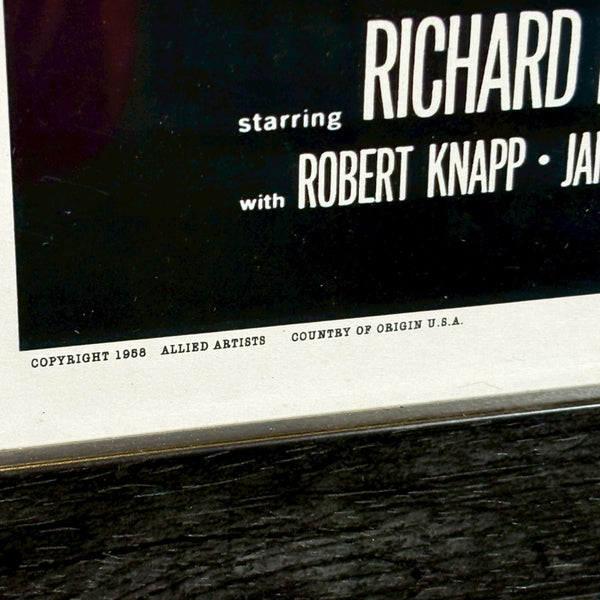 額装済みのため、そのまま壁に飾ることができます。1950年代特有のビジュアルを持ちながらも、どこか緊張感を含んだ佇まいは、アメリカンヴィンテージ、ガレージ、書斎、ショップディスプレイに好相性。空間に1958年という時代の複雑さを静かに添えてくれる一枚です。