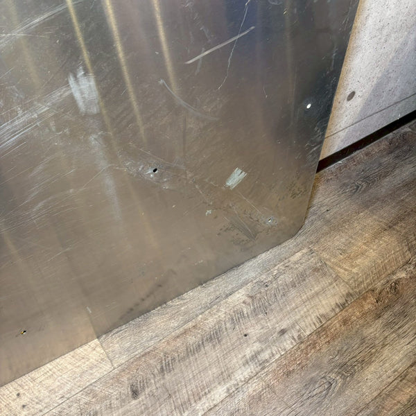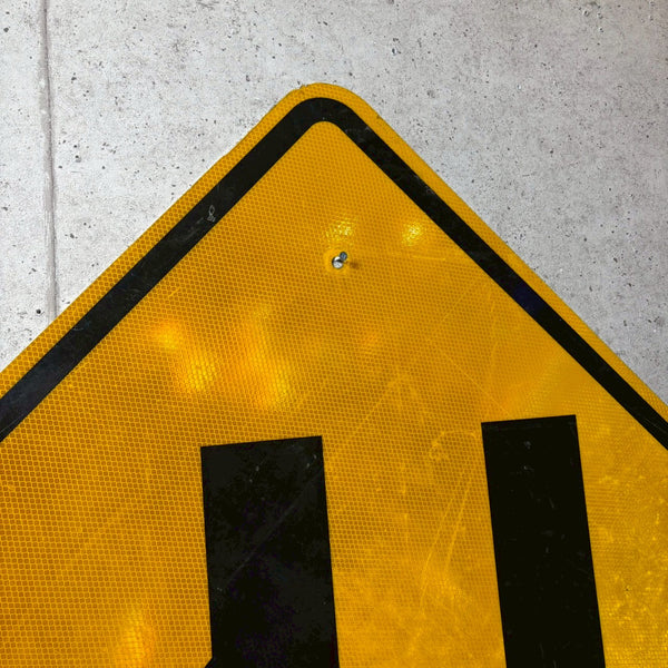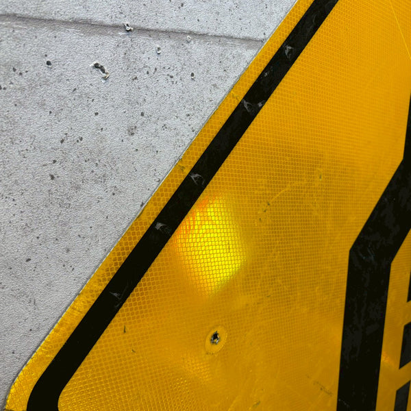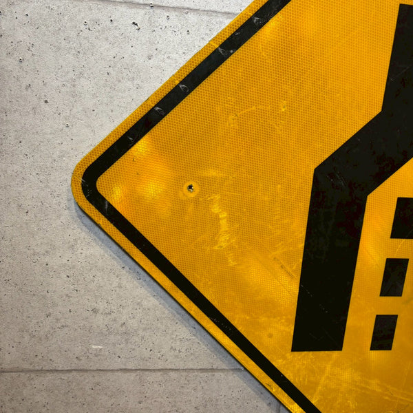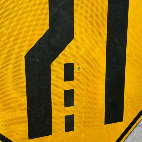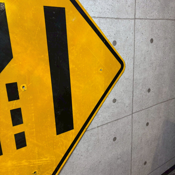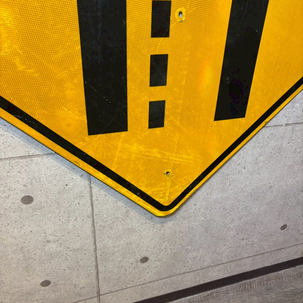 こちらは、ひし形デザインの道路標識で、車線が減少することをドライバーに知らせる「車線減少(Lane Ends)」の実使用ヴィンテージサインです。幅125センチ、高さ125センチ(ひし形時の直径)の大きなサイズは、高速道路や幹線道路などで遠くからでも視認できるよう設計されており、安全に車線変更を行うために不可欠な標識として使用されていました。黄色地に黒い矢印や図形が描かれたデザインは、アメリカ交通局(MUTCD)の基準に沿っており、注意喚起の効果を高めています。