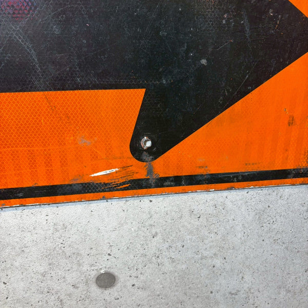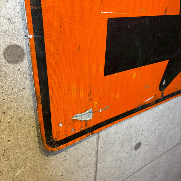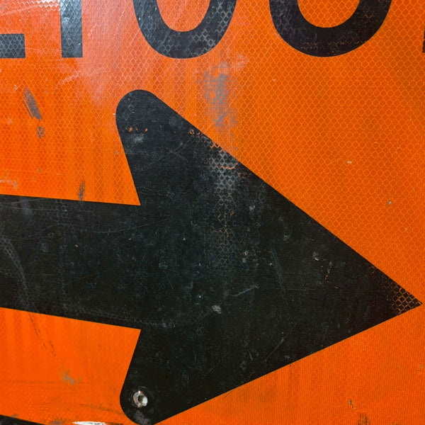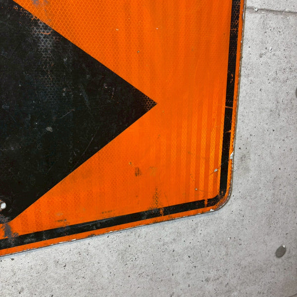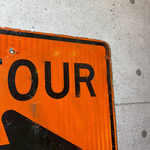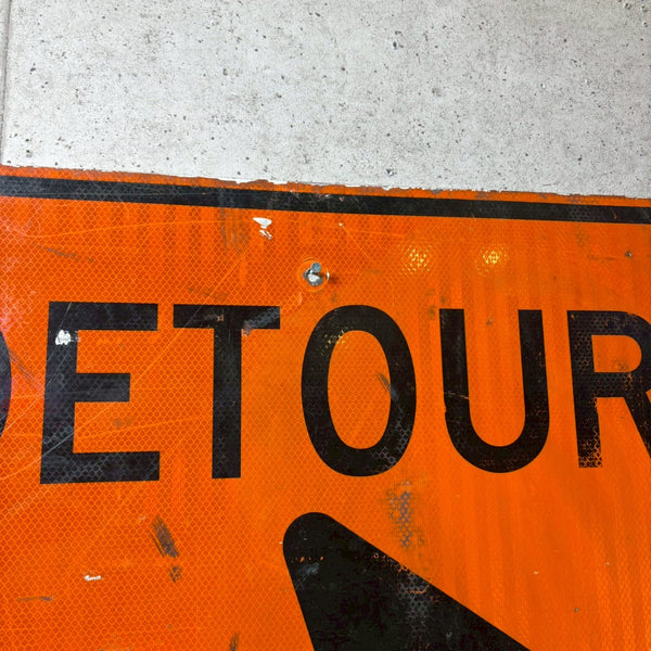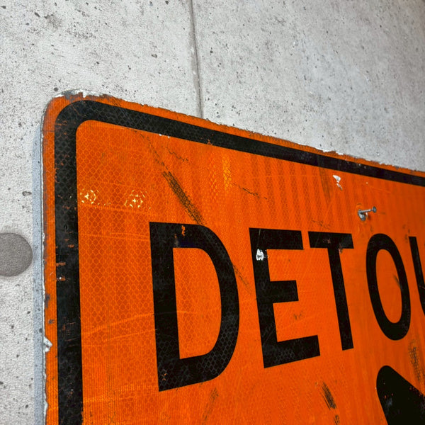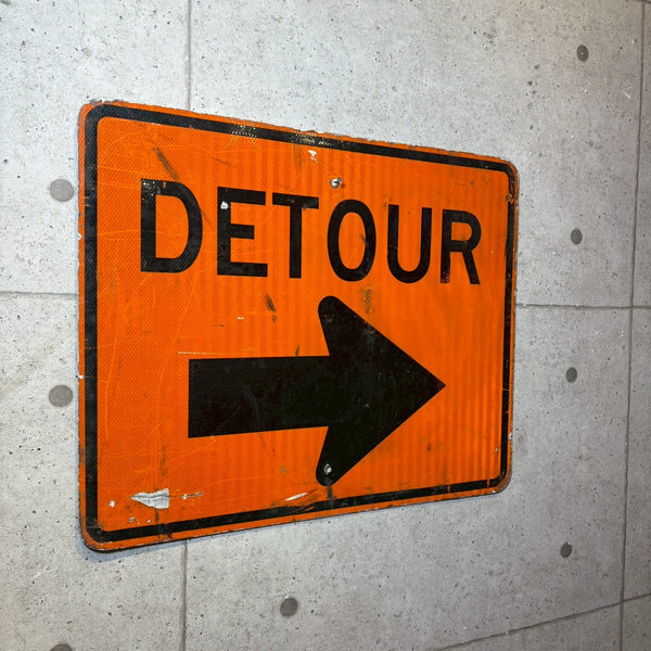 こちらは、オレンジ地に黒文字で「DETOUR」と表示され、右方向を指す矢印が描かれたアメリカの道路標識です。主に道路工事や一時的な通行止めの際に、ドライバーに迂回路を示す目的で設置されていた実使用タイプのサインで、進行方向を安全に誘導する役割を担っていました。オレンジ地に黒文字・矢印の配色は視認性が高く、遠くからでも進路の変更が直感的に分かるよう設計されています。