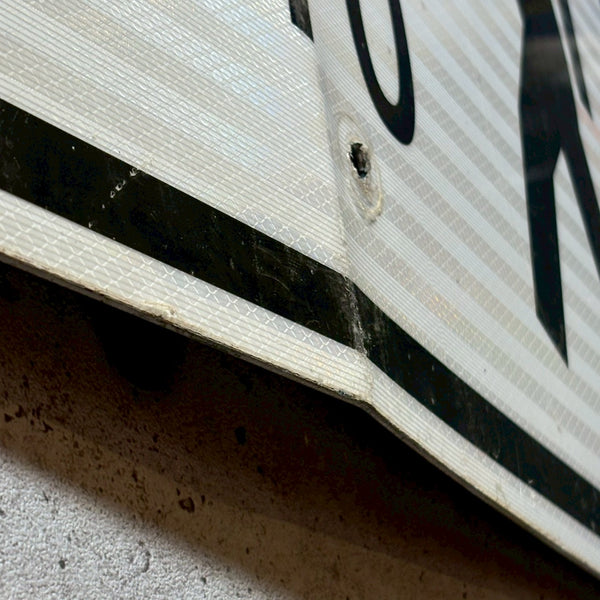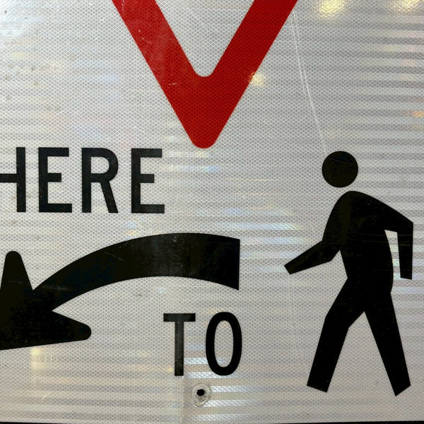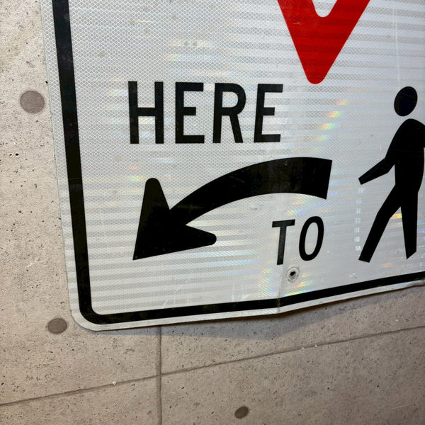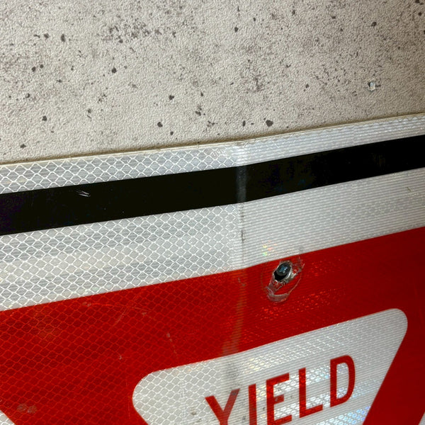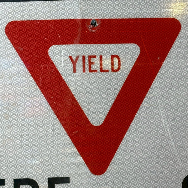 こちらは、アメリカで実際に使用されていた「YIELD(道を譲る)」標識です。横断歩道や交差点などで、歩行者や他の車両に優先権を与える必要があることをドライバーに知らせる目的で設置されていました。「YIELD」の文字は「道を譲る」という意味を持ち、歩行者が横断歩道や交差点にいる場合、車両は停止または減速して歩行者を先に通すことが求められることを示しています。特に歩行者の交通量が多い都市部や学校周辺、商業地帯などで広く使用されてきた標識です。