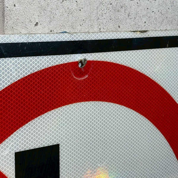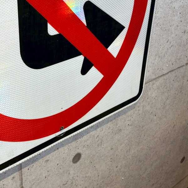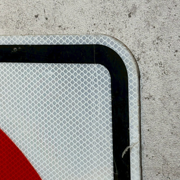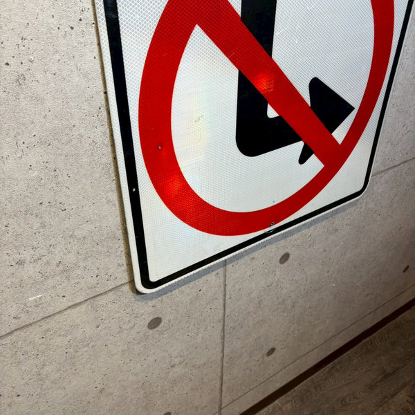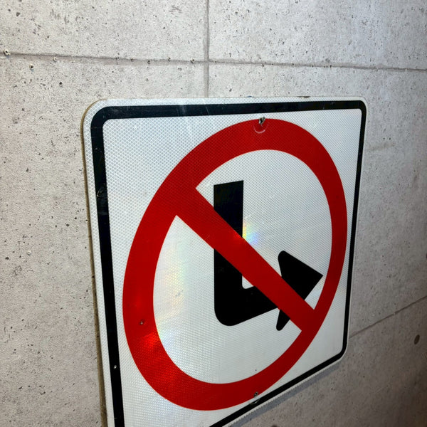 こちらはアメリカで実際に使用されていた「右折禁止」の道路標識で、正方形サイズが目を引く存在感を放ちます。標識のデザインは、視認性を重視したシンプルかつ力強いもので、当時は都市部や幹線道路沿いで右折を制限するために設置され、ドライバーに安全な交通ルールを知らせる役割を果たしていました。道路標識として、交通の流れを円滑にし、事故防止のために欠かせない存在でした。