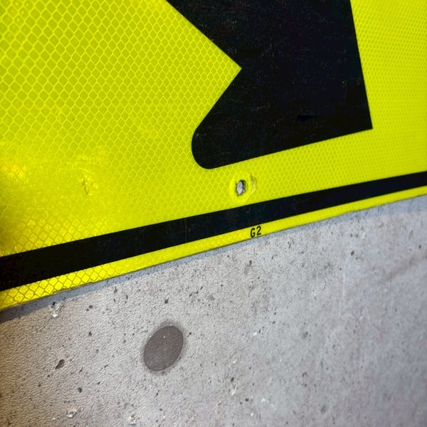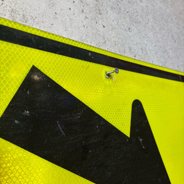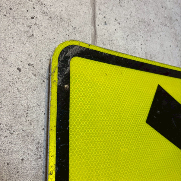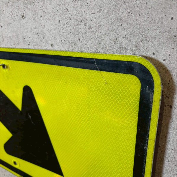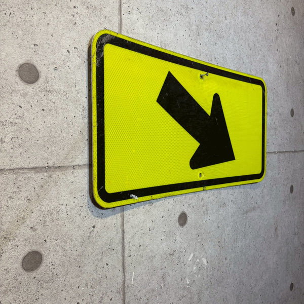 こちらは、右斜め下を指す矢印が描かれた黄色い道路標識です。主にアメリカの道路や工事現場などで、進行方向を誘導する目的で使用されていたタイプのサインで、ドライバーに車線の分岐やカーブ、あるいは工事区間での進路変更を知らせる役割を持っていました。視認性の高いイエローカラーに黒い矢印というシンプルな配色は、遠くからでも瞬時に注意を引くよう設計されており、安全を守るための工学的なデザインが感じられます。