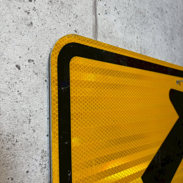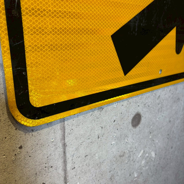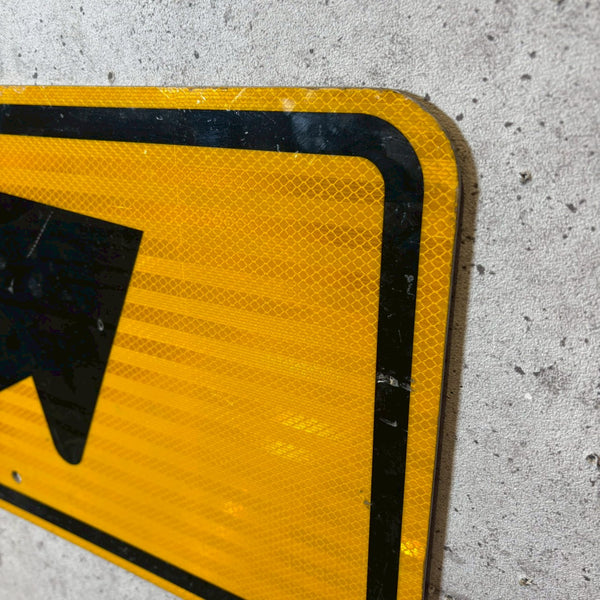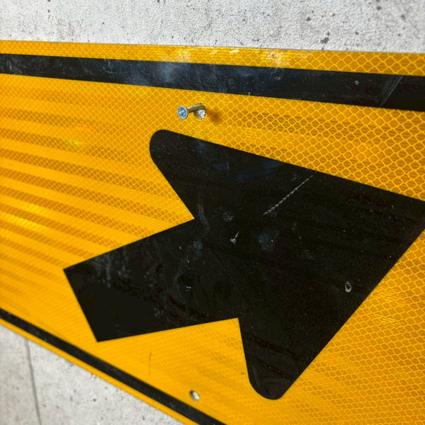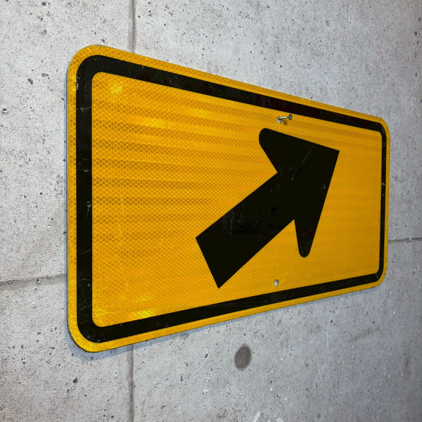 こちらは、右上方向を指す黒い矢印が描かれた黄色の道路標識です。主にアメリカの道路で、進行方向を示すために使用されていた実使用タイプの標識で、車線変更や道路工事、分岐点などでドライバーを安全に誘導する役割を担っていました。黄色地に黒い矢印というコントラストの強いデザインは、遠方からでも瞬時に認識できるよう考えられたもので、安全性と視認性を重視したアメリカ交通局(MUTCD)規格に基づくデザインです。