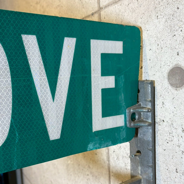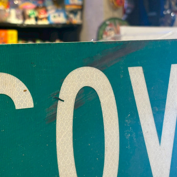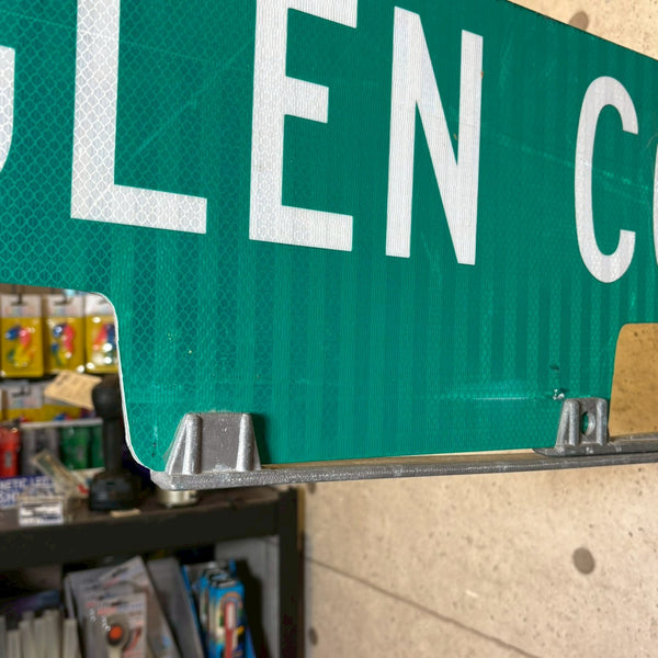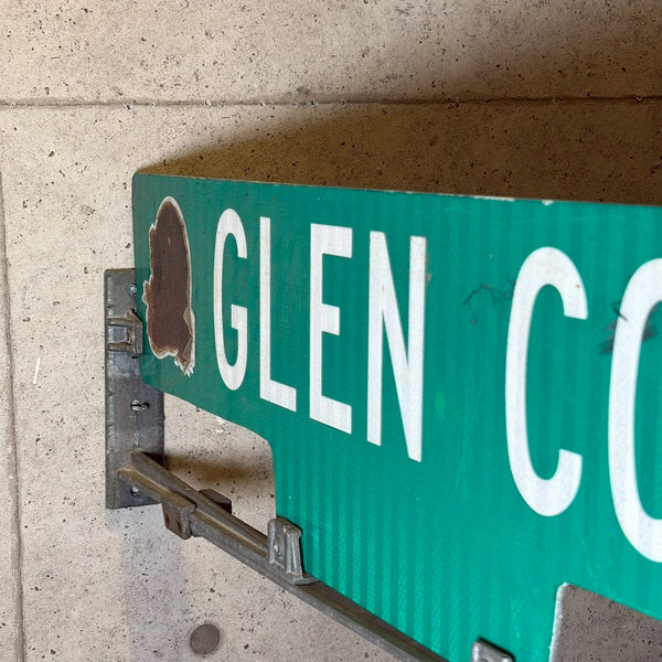 こちらの「GLEN COVE」の道路看板は、アメリカ・ニューヨーク州ロングアイランド北部、ナッソー郡の市「Glen Cove」に実際に設置されていたヴィンテージ道路標識です。Glen Coveはかつてニューヨーク市の富裕層が別荘を建てた歴史を持つ港町で、美しい海岸線と緑豊かな丘陵地帯に囲まれ、落ち着いた高級住宅街として知られています。そのためこの看板も、住宅街や郊外道路で車や歩行者の案内として長年使用され、Glen Coveエリアの静かで洗練された雰囲気を象徴する存在でした。