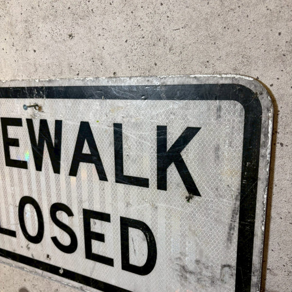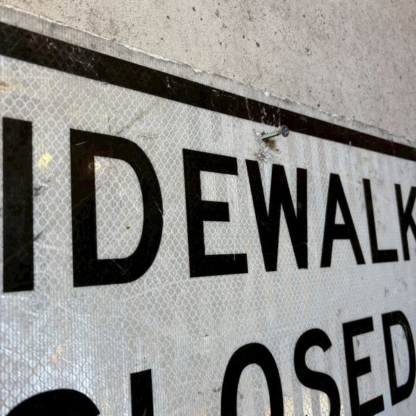 このような「SIDEWALK CLOSED」サインは、アメリカ各都市の再開発やインフラ整備が盛んだった1970〜1990年代に特によく見られたタイプで、街中の工事区域やビル建設現場、道路補修エリアなどで実際に使用されていました。看板の塗装や表面の擦れには、長年屋外で使用されてきたリアルな使用感があり、当時の都市景観をそのまま切り取ったような雰囲気を持っています。