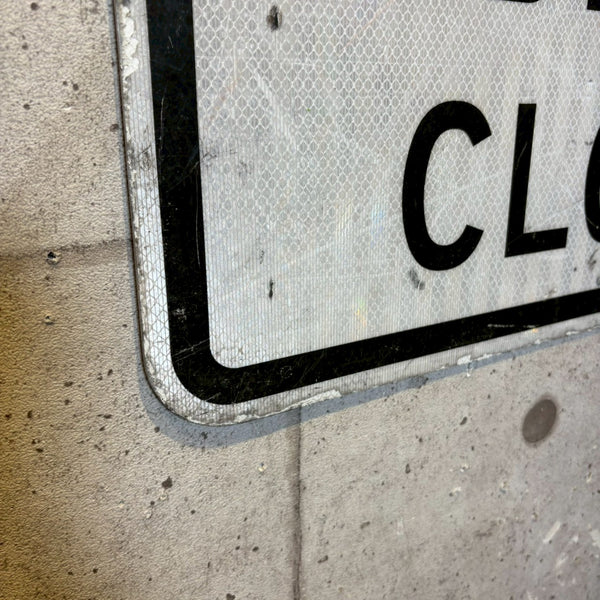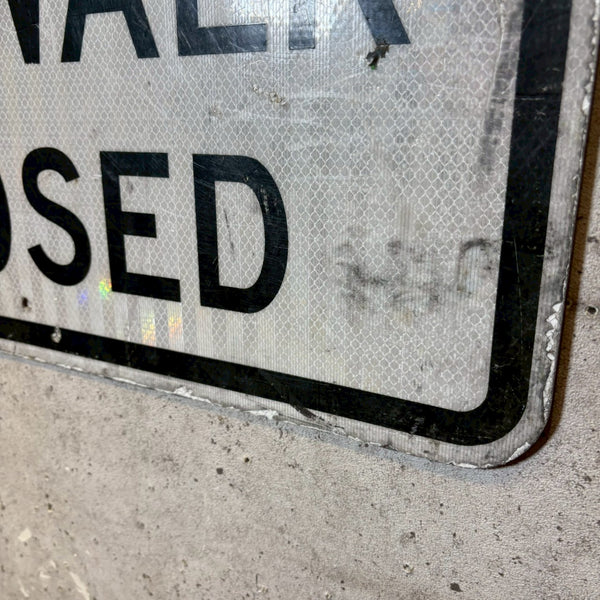 こちらは、「SIDEWALK CLOSED(歩道閉鎖)」と大きく書かれたアメリカの道路標識です。主に工事現場や道路補修の際、歩行者の安全を確保するために使用されていた看板で、一時的に通行止めとなった歩道の入り口などに設置されていました。視認性を高めるために、白地に太い黒文字で明確に表示されており、遠くからでも一目で通行制限を認識できるようデザインされています。