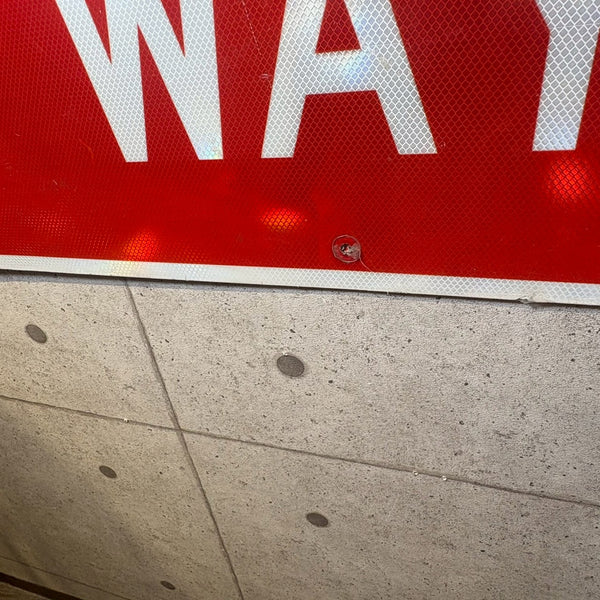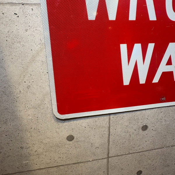 こちらは、赤地に白文字で「WRONG WAY」と表示されたアメリカの道路標識で、実際に道路上で使用されていたヴィンテージサインです。主に高速道路や一方通行路の進入禁止箇所で設置され、ドライバーに誤った進行方向に進入しないよう警告する目的で使われてきました。その鮮やかな赤色と白文字の組み合わせは、遠くからでも瞬時に注意を引くよう設計されており、安全確保のために不可欠なサインとして機能していました。