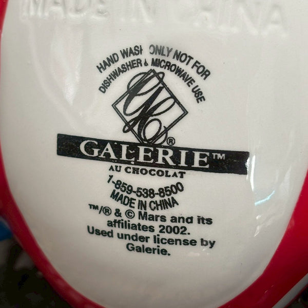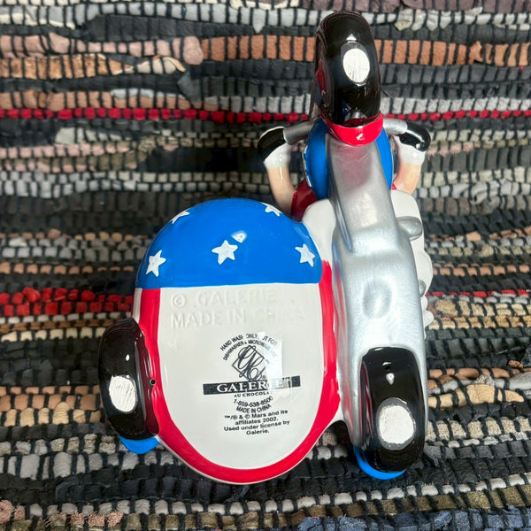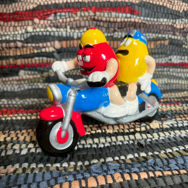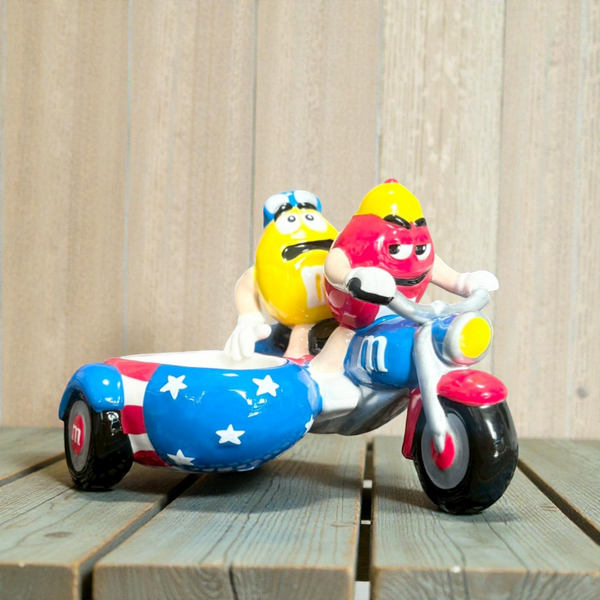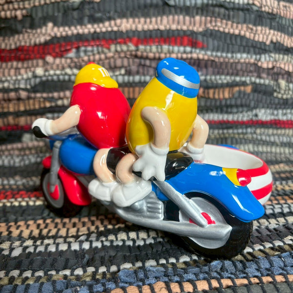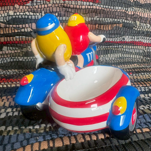 M&M’sのキャラクターであるレッドとイエローが、アメリカの星条旗デザインのサイドカー付きバイクに乗った姿を表現した、2002年製の陶器製キャンディディッシュです。
