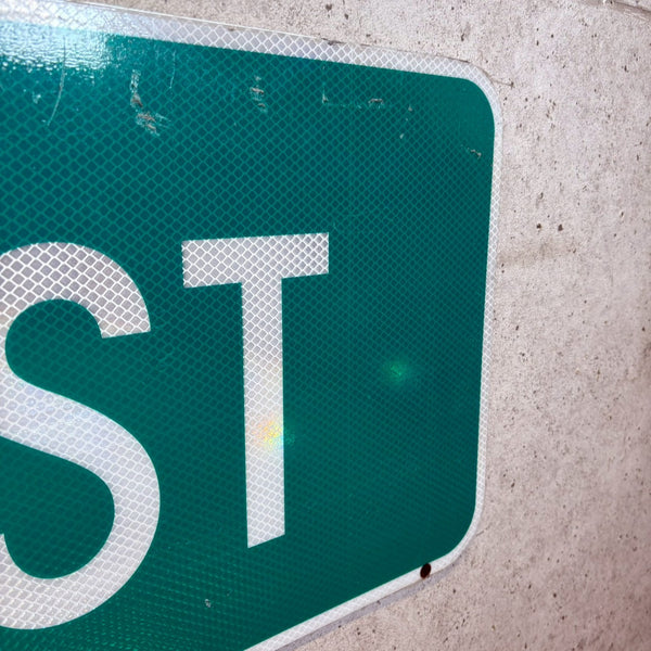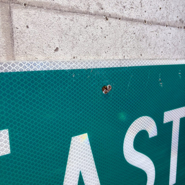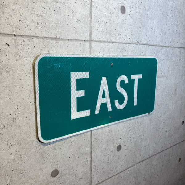 こちらは「EAST」と記された看板道路で、緑を控えた落ち着いた色合いが特徴です。 コンパクトながら視認性の高いサイズで、当時の道路標識として実際に使用されていたことがございます。